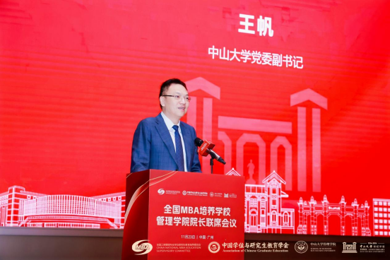 中山大学党委副书记王帆首先代表东道主致辞,欢迎与会的教育部有关领导、全国MBA教指委委员及全国MBA培养学校管理学院相关负责人,介绍了百年中大的辉煌历史与发展成果,同时结合习总书记致中山大学建校100周年的贺信,强调MBA教育要传承红色基因,培养具有坚定理想信念和高度社会责任感的商业领袖;要为党育人、为国育才,培育具备企业家精神的毕业生;要服务国家重大战略和地方经济发展;要推进教育改革,助力专业学位教育创新发展。并预祝大会取得圆满成功。