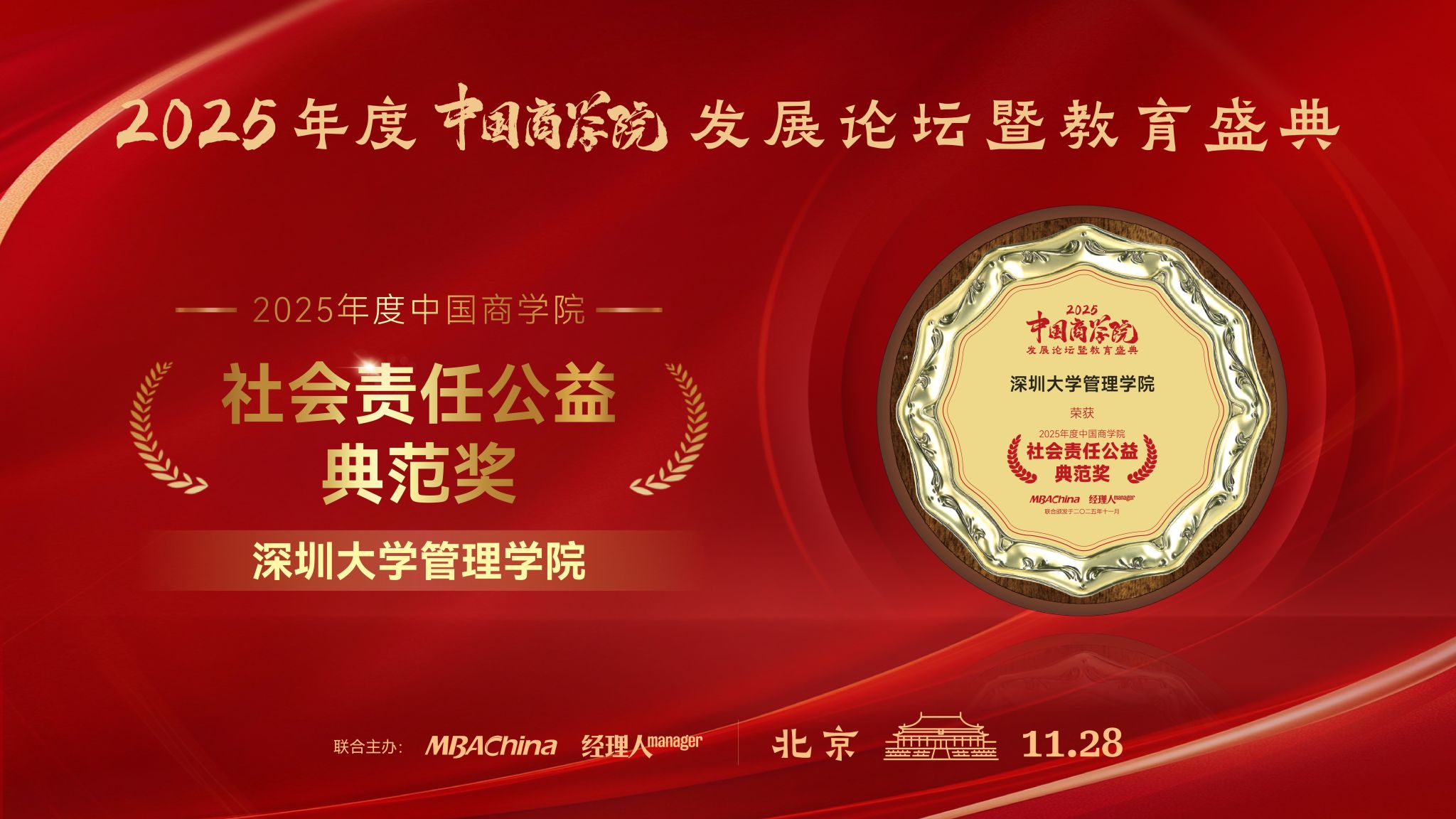 深圳大学管理学院荣获“2025年度中国商学院社会责任公益奖”。该奖项旨在激励更多商学院将社会责任深度融入办学实践,以教育赋能公益、以实践反哺社会,助力社会可持续发展。既是对获奖院校公益实践成果的权威认可,更是对其坚守教育初心、深耕社会责任领域的崇高赞誉。