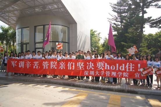 2011年9月15日,管理学院2011级新生在深圳大学北门顺利登车,前往葵涌,开始为期十天的军训生活。深圳大学章必功校长、阮双琛副校长、李永华副校长、管理学院陈智民院长、宋涛书记等领导和老师亲自欢送11级新生军训。