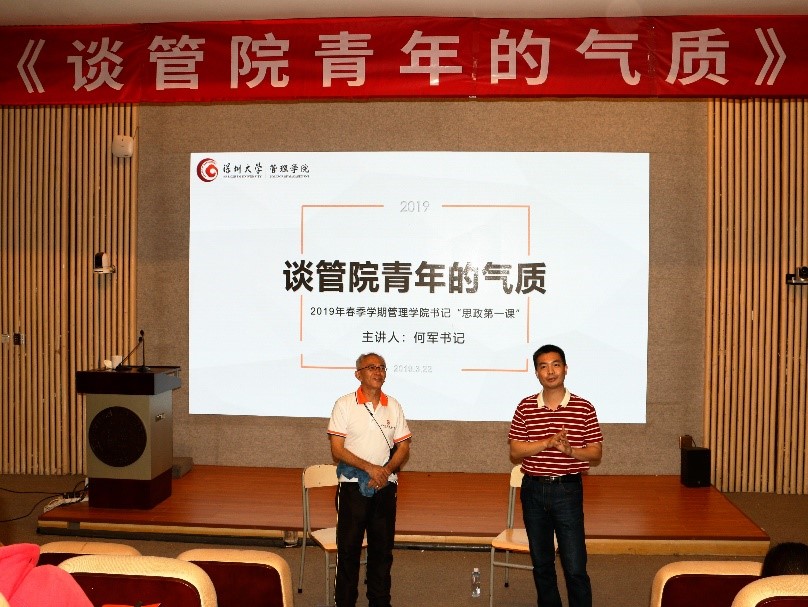 为贯彻落实习近平新时代中国特色社会主义思想、党的十九大精神和新时代全国高等学校本科教育工作会议要求,管理学院于3月21日晚在科技楼三号报告厅成功举办了2019年春季新学期管理学院书记思政第一课,本次讲座主题为“谈管院青年的气质”,讲座由管理学院党委书记何军老师主讲,周南老师作为特邀嘉宾前来助阵,管理学院本科生支部党员和院团委、学生会干部聆听了该讲座。