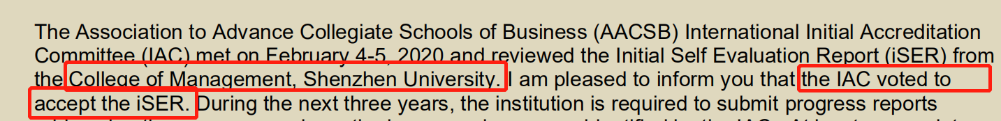 喜讯!2020年3月17日,国际精英商学院联合会(The Association to Advance Collegiate Schools of Business, AACSB)总部来函,经AACSB初审委员会(Initial Accreditation Committee, IAC)集体投票表决,深圳大学管理学院提交的《初始自评报告》(iSER报告)于2020年2月4日-5日在美国田纳西召开的会议上喜获通过,这是管理学院AACSB国际认证工作的一个重大阶段性成果,标志着我院的AACSB国际认证已进入最后冲刺阶段,有望在两年内最终获得认证通过。