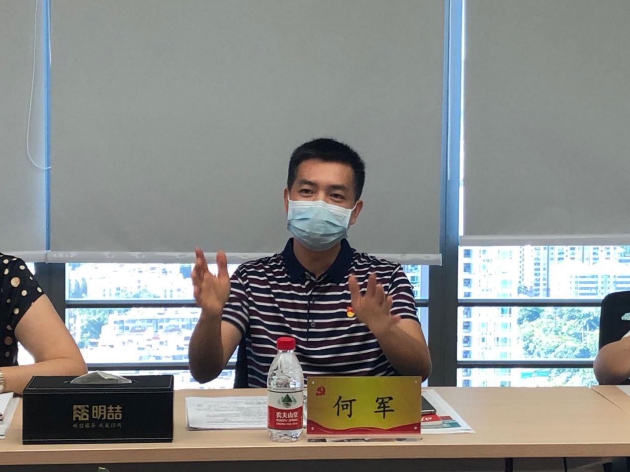 会上,高董事长首先介绍了公司的发展情况和管理理念,之后重点就公司的党建工作进行了详细阐述。他强调,共产党人拥有着巨大的力量,那就是信仰的力量。将共产党人信仰的力量与明喆人的愿景进行一个紧密的结合从而形成合力,会产生更大的作用。因此,明喆的核心管理人员都要以共产党员的标准严格要求自己。同时为了进一步发挥共产党员的先锋模范作用,明喆的关键岗位和重要岗位必须是共产党员。在这样的管理思路之下,公司形成了积极踊跃的入党氛围,大家在日常工作中都能以党员标准进行自我要求。高董事长还特别提到,深圳收治新冠病人的两家医院的物业服务,均是由明喆提供的。在国难当头的背景下,明喆人没有退缩,而是主动站出来,豁出去,纷纷自告奋勇去一线支援。高董事长表示,目前公司的党建仍是“进行时”,后续还有更大的完善空间。