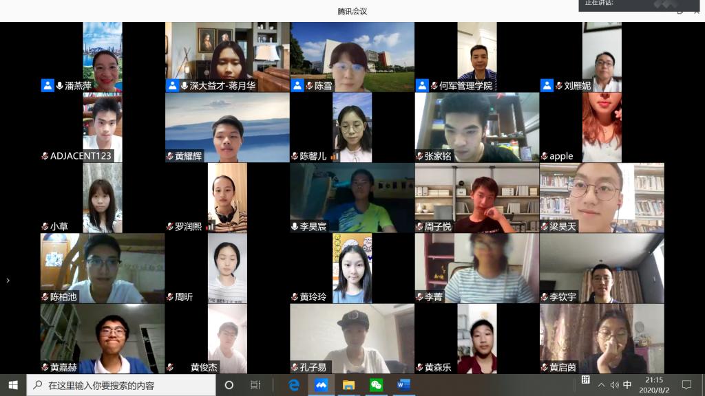 从全国45所高中学校的150名优秀高中学子中脱颖而出的102名高中生,以及通过自荐/他荐择优录取的21名大学生组成了大学生为组长、高中生为组员的21个小组。经过六天的学习、交流和分享,同学们修习了全部线上课程,合作完成了创业项目策划,并在8月2日以小组路演的形式展示了各自的项目成果。伴随着8月2日晚上颁奖典礼的音乐,2020年深圳大学云端创新创业夏令营圆满结束!