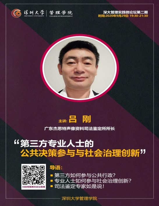 为践行管理学“知行合一”的理念,深圳大学管理学院最新推出“深大管理实践微论坛”活动。第二期荣幸邀请到中国司法鉴定专家、广东杰思特声像资料司法鉴定所所长吕刚先生分享第三方专业人士如何推动社会治理创新,如何在立法、行政与司法的互动过程中发挥第三方作用。欢迎感兴趣的师生观看腾讯会议直播。