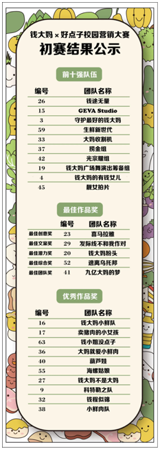 宣讲会结束后,接近两个月的认真准备,参赛选手们完成了各具特色的营销方案和创意短视频,最终,根据企业方和校方的打分总和排名,晋级决赛的十强诞生。