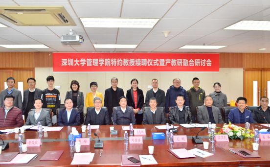 12月19日下午,深圳大学管理学院特约教授续聘仪式暨产教研融合研讨会在管理学院1400会议室圆满举行。深圳大学党委范志刚副书记、研究生院副院长李国教授、一流大学创建办公室副主任曾宪聚副教授、管理学院院长李丽教授、副院长潘燕春教授、管理学院教授委员会主任林旭东教授、续聘特约教授深圳传世智慧科技有限公司合伙人顾新宇副总裁、深圳报业集团深圳新闻网校友汇创办人柯旭东、深圳市中金岭南有色金属股份有限公司投资发展部李昌政总经理、深圳达实智能股份有限公司刘磅董事长、深圳市博信投资控股股份有限公司/深圳市泽小童科技有限公司刘国真总裁、深圳华侨城股份有限公司旅游事业部总经理兼锦绣中华王刚董事长、深圳担保集团有限公司温卫民总经理、深圳市奋达科技股份有限公司肖奋董事长、深圳市科技类社会组织联合党委周庆明副书记、MBA教育中心主任贺和平教授、马欣川教授、潘燕萍老师出席了会议。会议由管理学院副院长马卫红教授主持。