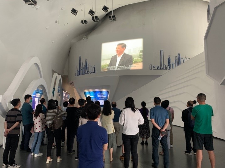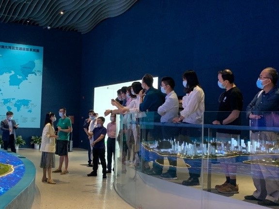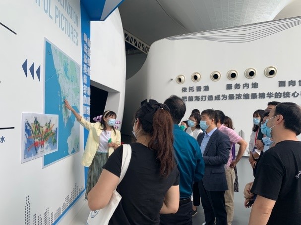 嘉宾一行首先到达前海展示厅,讲解员先为到场嘉宾播放了《习近平总书记视察深圳前海》的视频,并介绍了深圳前海的发展历程,其中习近平总书记三次前往前海指导工作强调了前海模式的可行性与未来的推广、复制可能性,这一背景激发了参会嘉宾的强烈兴趣与探讨热情。深圳大学管理学院公共管理系主任刘筱教授结合深圳前海的规划蓝图及沙盘向嘉宾分享了自身对深圳前海发展的见解,并与嘉宾们对未来前海的发展策略、深港合作存在的困境与机遇等进行了探讨。