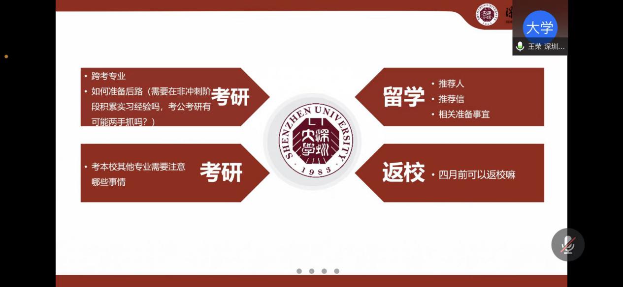阳春三月的深圳绿树红花。一波猝不及防的新冠疫情,却让春天的深圳蒙上了皑皑灰霾。2022年的新学期,也在这波突如其来的疫情中,以远程线上的方式开启。在学校的统一工作部署下,管理学院党委高度重视线上教学期间学生的学习效果及身心健康,以促进学生健康发展、加强师生交流、了解学生需求、解决学生困难为目的,在3月7日至18日组织本科一、二、三年级的38个班级开展了“网课健康都在线”主题班会活动。各班班主任、辅导员老师参加了班会活动。
