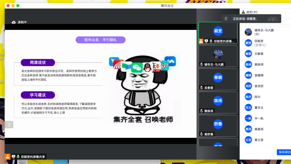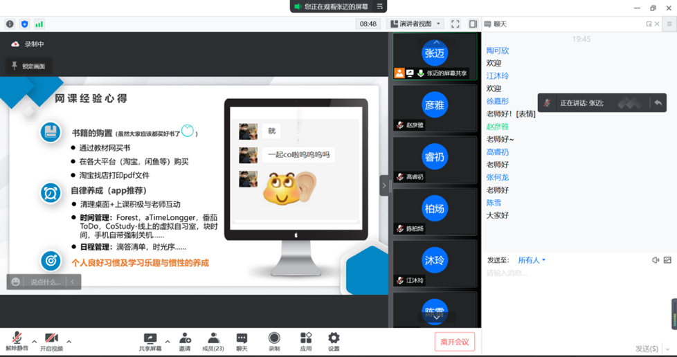 在班会前期筹备过程中,各班班委通过收集问卷的方式调研同学们在家的学习生活情况,包括线上学习的心得和困难,针对网课的建议意见,以及锻炼身体增强体质的经验等,为班会顺利有效地开展做了充分准备。同时,班会也邀请了班主任和辅导员老师参加,部分班级还邀请了班导班助以及师兄师姐来为同学们做分享。