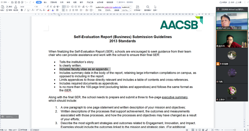 2022年4月15日上午9:00-10:00,管理学院召开AACSB国际认证工作推进会(线上)。管理学院副院长周志民教授、海外院长李天行教授、AACSB认证工作小组以及认证办公室成员参加了此次会议。