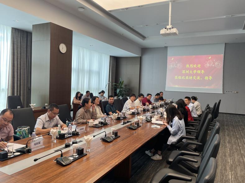 参观结束后,双方在会议室进行了深入交流。比亚迪人力资源处副总经理叶子首先就公司的基本情况和深大在职校友情况进行介绍。他提到比亚迪的品牌使命是用技术创新满足人们对美好生活的向往,比亚迪的“技术鱼池”目前已囊括4万多研发人员、11大技术研究院、申请专业3.5万项。他表示,双方在联合申报科研项目、技术攻关成果转化、实习教学基地、联合培养基地、产教融合、共建联合专家团队、共办技术论坛等领域有巨大的合作潜力。比亚迪人力资源处总经理王珍表示,比亚迪是一家注重优质人才培养的企业,对员工职业生涯规划、个人关怀等提供全面的支持,期待与深大共同在科学研究、人才培养、管理咨询等方面探索更多的可能。