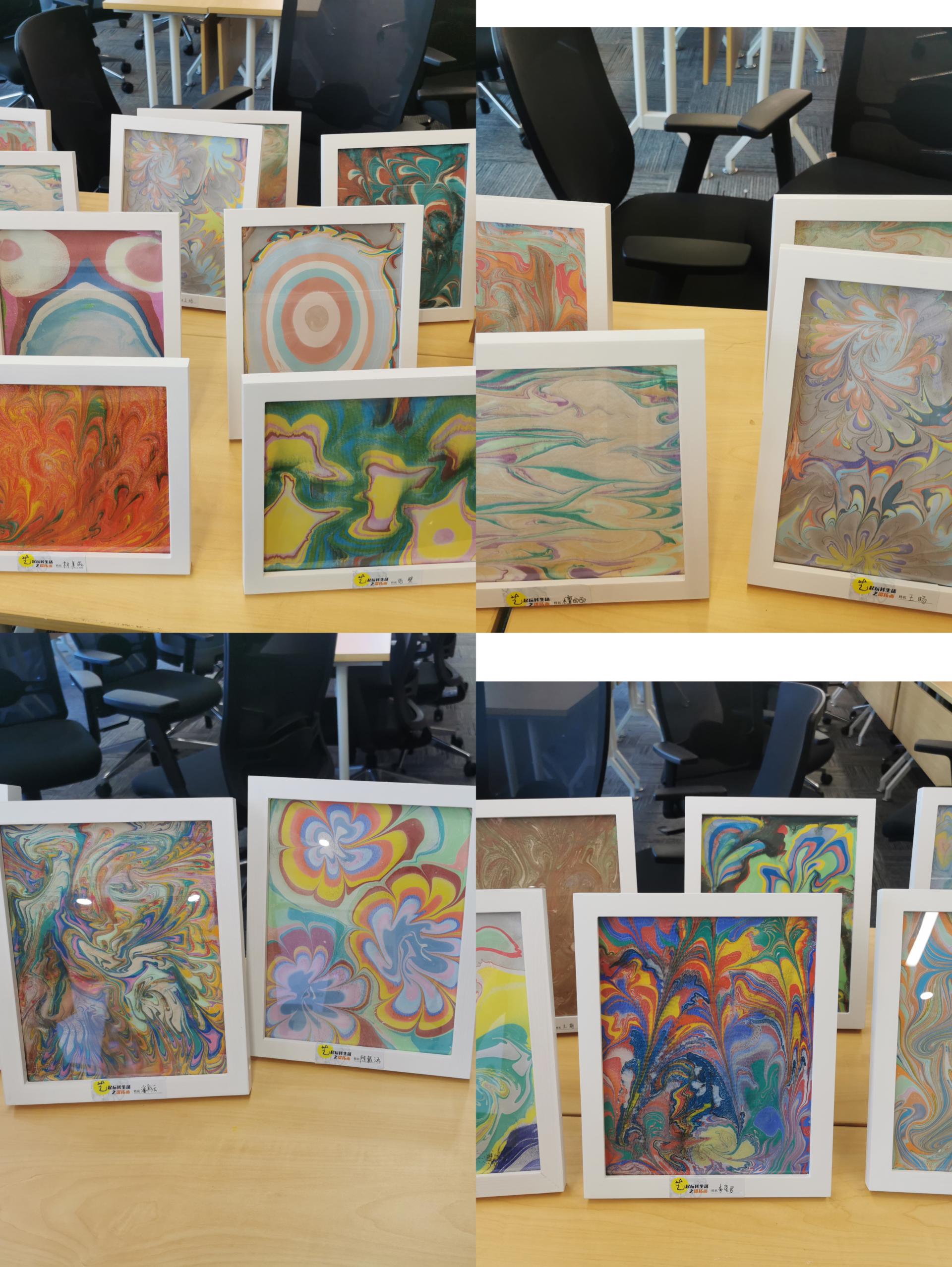 在活动现场,专业的湿拓画老师介绍了湿拓画的起源,讲述了湿拓画的制作方法,并现场演示、教学,在老师的指导下,教职工们把颜料滴入画液盘中,用画针轻轻划过液面,各色颜料随着画针纷纷“舞动”起来,在水波荡漾间,一幅幅美轮美奂的绘画作品跃然纸上。一次创作未能尽兴,老师们便纷纷动手创作了多幅画作,在“探究、发现、创造”中进行了一次次独特的美的艺术体验。