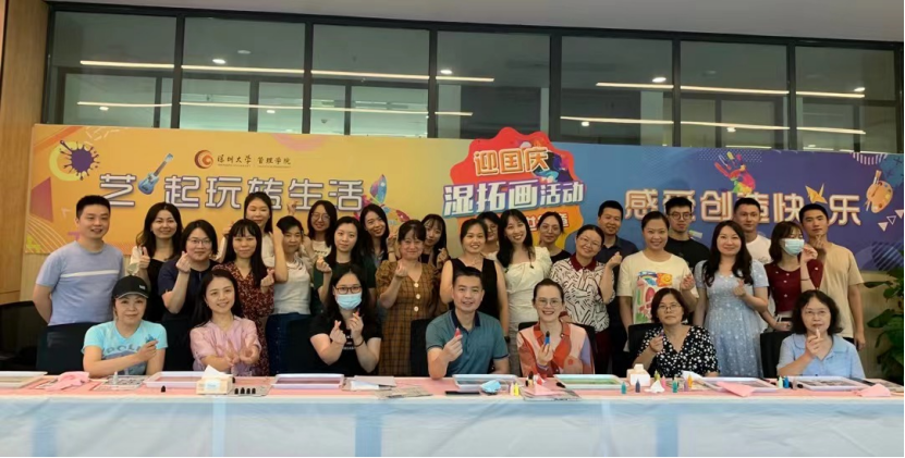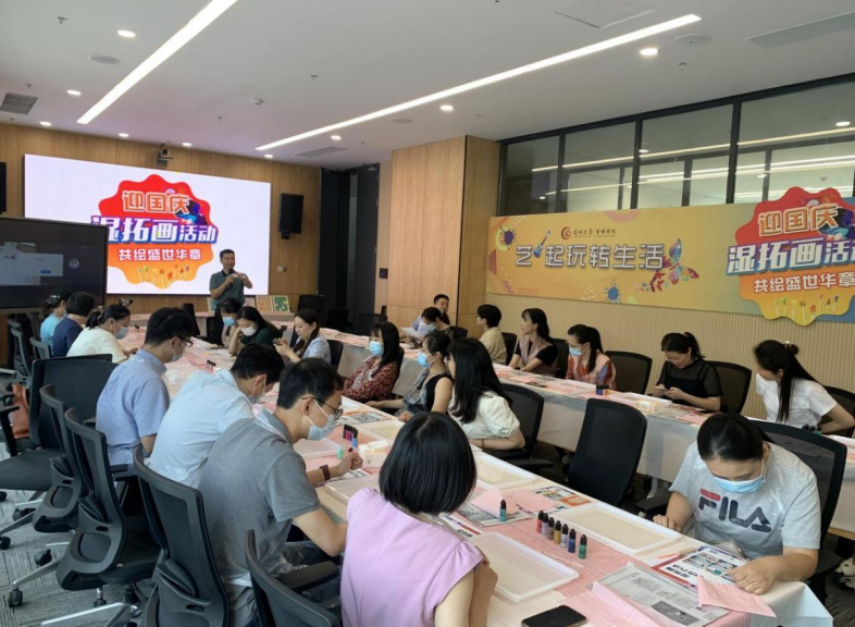 9月29日中午,深圳大学管理学院“艺”起玩转生活之迎国庆湿拓画活动在明理楼A205成功举办,教职工共聚一堂,进行了一场水中作画,一起欢度国庆!
