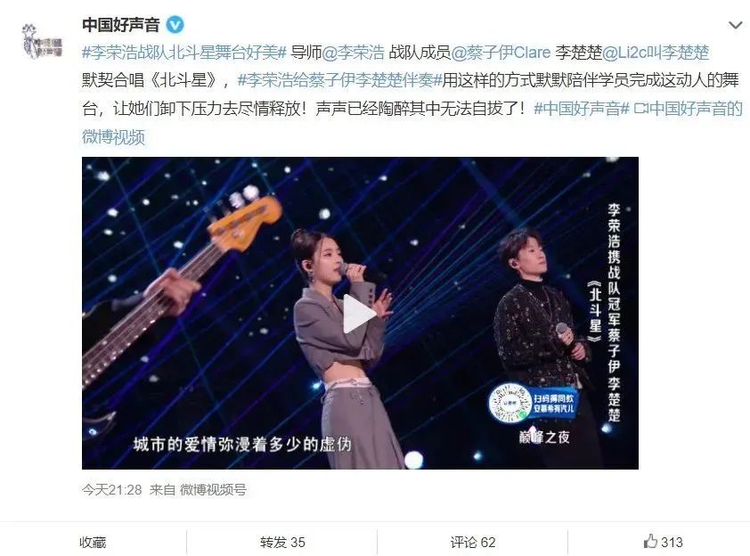 依照惯例,每位学员冠军之夜的第一首歌都由导师共同演绎。但不按常理出牌的李荣浩选择把舞台百分百交给学员蔡子伊和李楚楚共同演唱《北斗星》,自己则拿起贝斯帮她们伴奏。这是李荣浩第一次没有参与合唱,他表示此举是为了让学员能更放松,享受“玩音乐”的感觉。