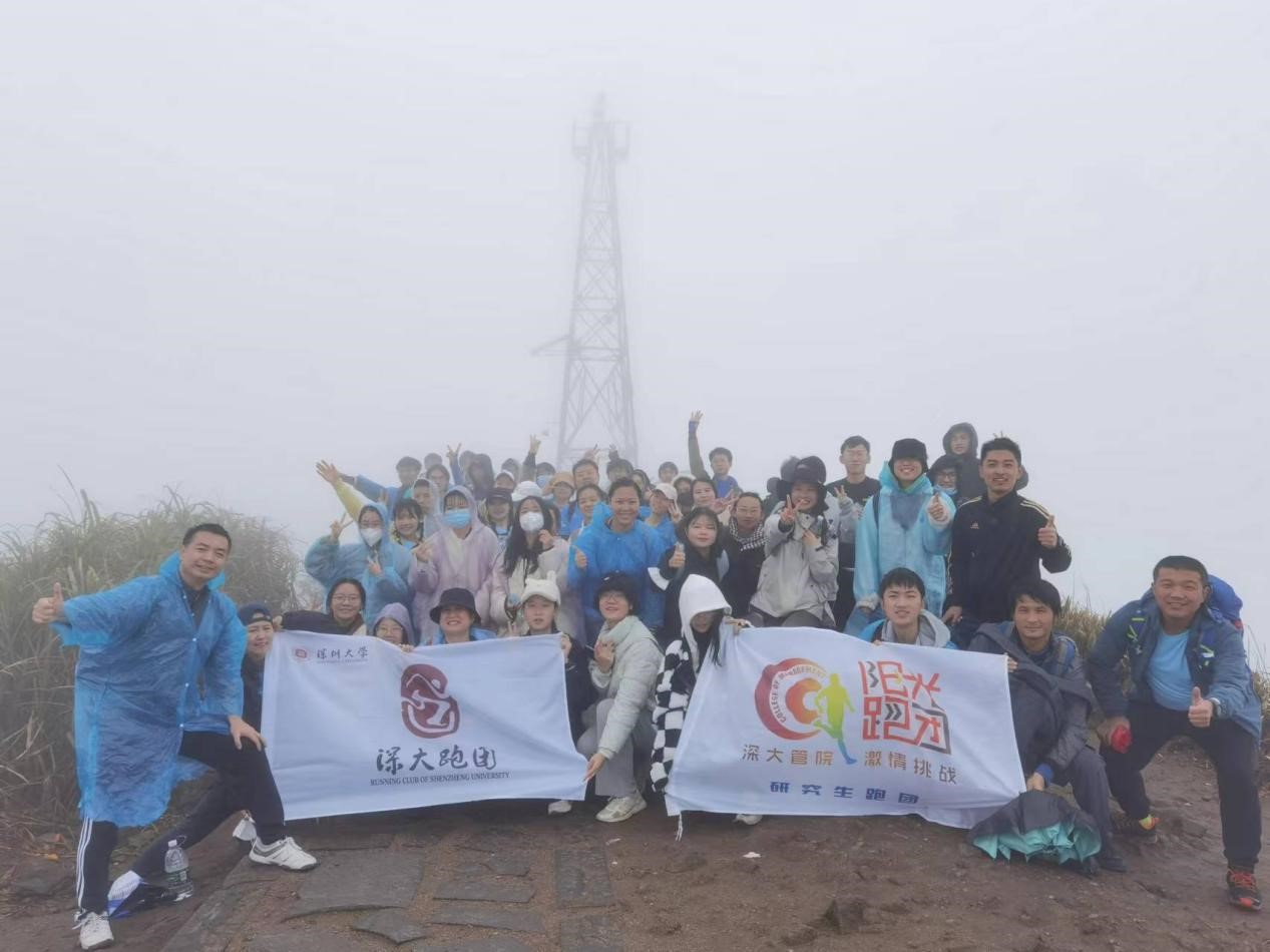 高峰见山海,风雨梅沙尖。虽然天气原因云雾遮挡了山脚下的景色,但这也让我们更加注意到陪伴在我们身边的小伙伴们。风吹和细雨阻挡不住跑团成员前进的脚步,希望在接下来的学习与生活中,大家也保持好这股韧性,继续完成好未来的各种挑战。