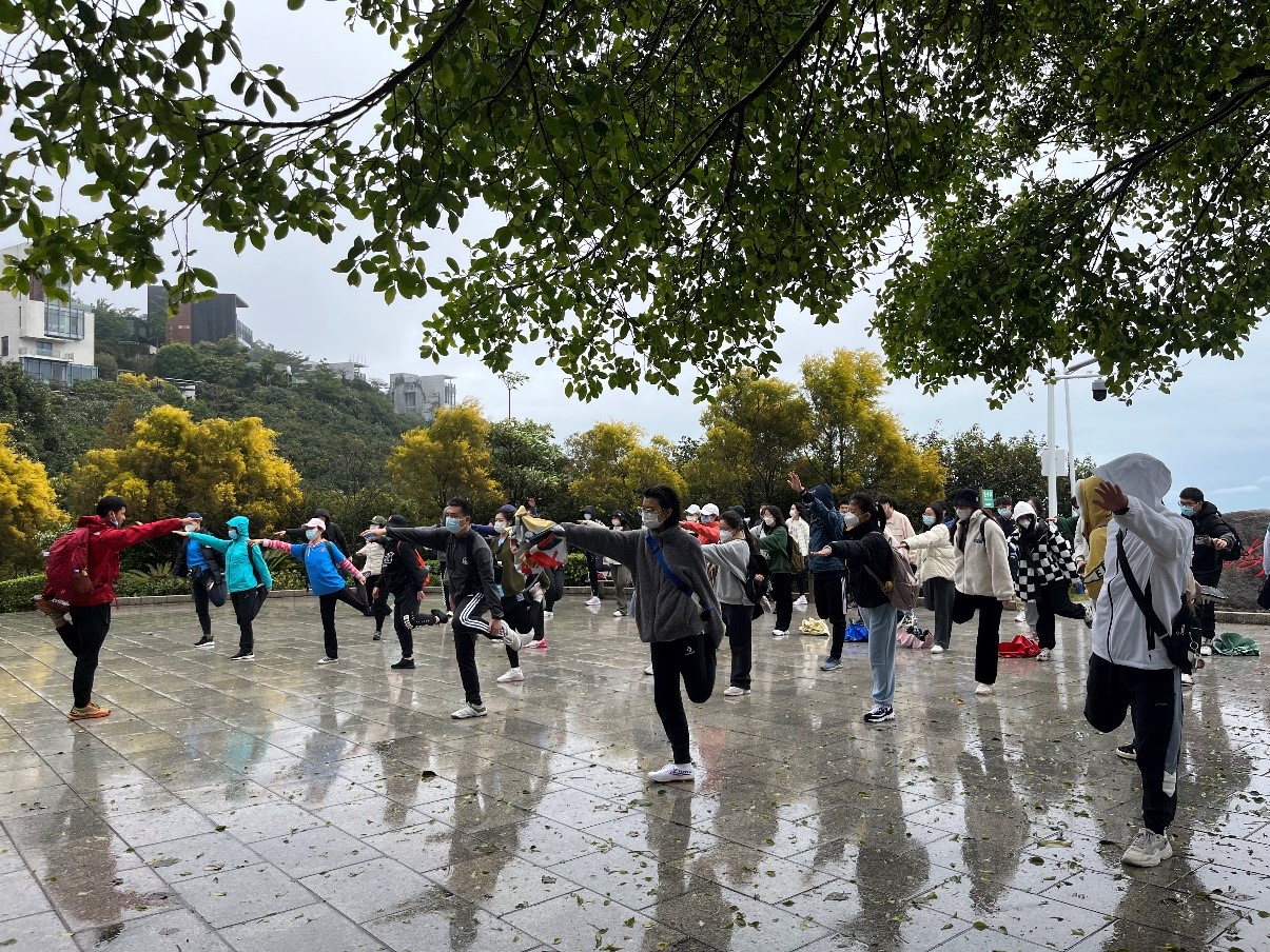 本次挑战计划从梅沙尖山腰出发登顶,之后从另一侧下到山脚,难度较低。到达山腰后,专业教练向大家介绍了此次活动的全流程和注意事项,让大家根据自身的体能素质分为两个小队,并且带领老师和同学们进行了登山前的热身活动。