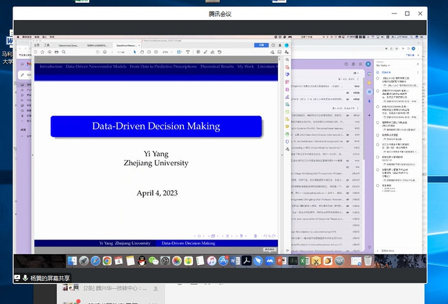 2023年4月4日上午,深圳大学40周年校庆800场学术活动 (第426场)之管理学院学术讲座,以线上形式成功举办,本次讲座特邀杨翼教授为主讲嘉宾,主讲题目为“Data-driven Decision Making”,管理学院牛奔教授做主持,校内多名师生参加。