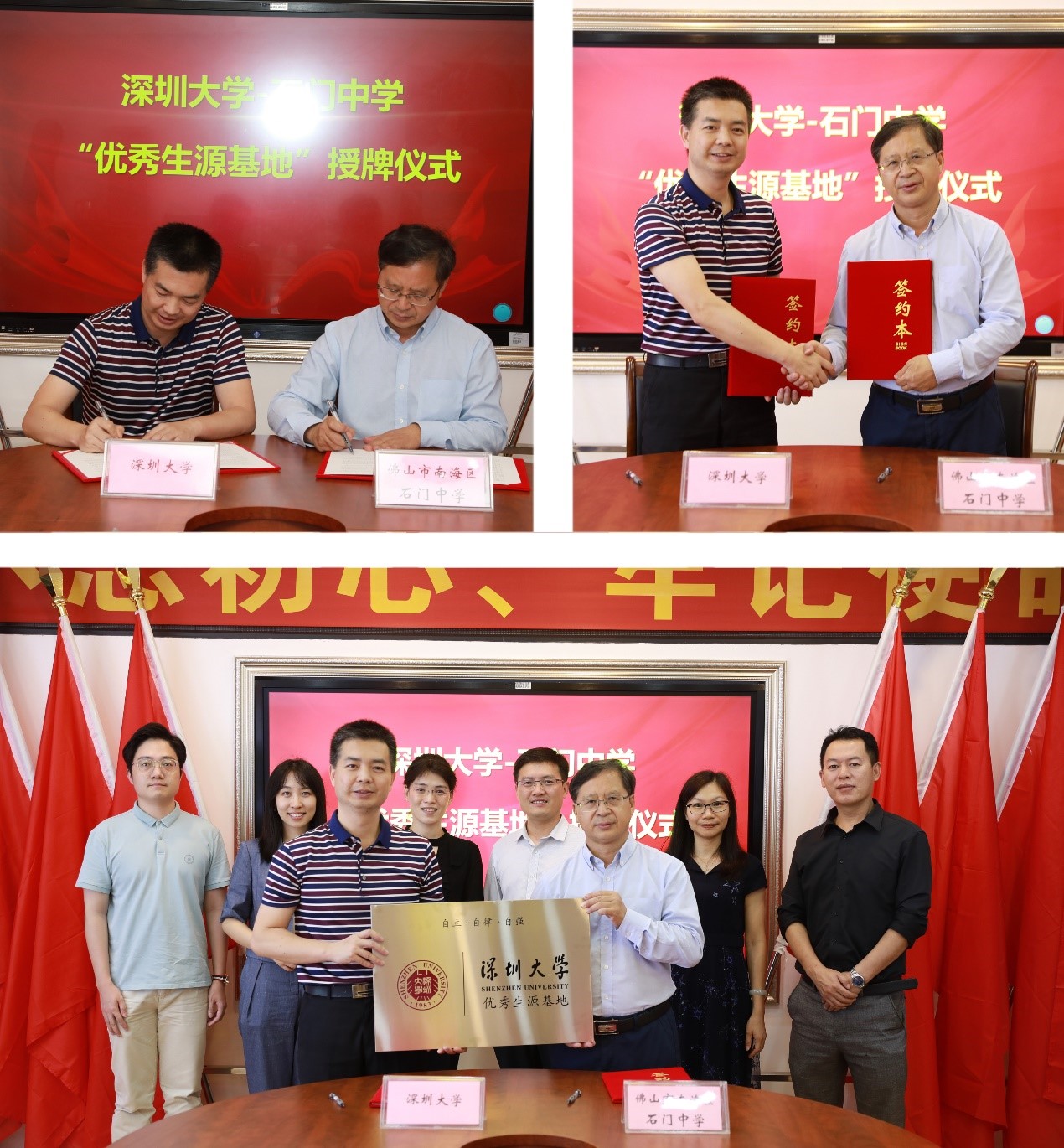 为加强招生宣传工作的精准性和实效性、进一步增进我校与目标中学的联系,2023年4月21日,在深圳大学管理学院的组织与招生办的支持下,管理学院何军书记、招生办朱玲燕老师、管理学院教学秘书宋宜诺走访佛山市南海区石门中学,进行优秀生源基地签约授牌仪式、并送去“喜报”。石门中学李卫东校长、陈冰锋副校长、张国君副校长、高三年级小组刘伟主任、学生发展中心沈敏姬主任及几位高三班主任老师出席了授牌仪式。
