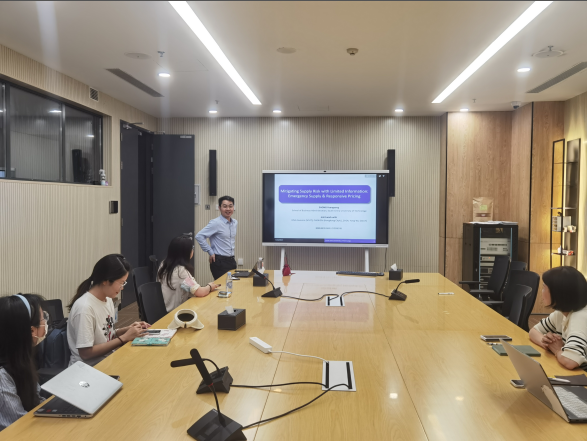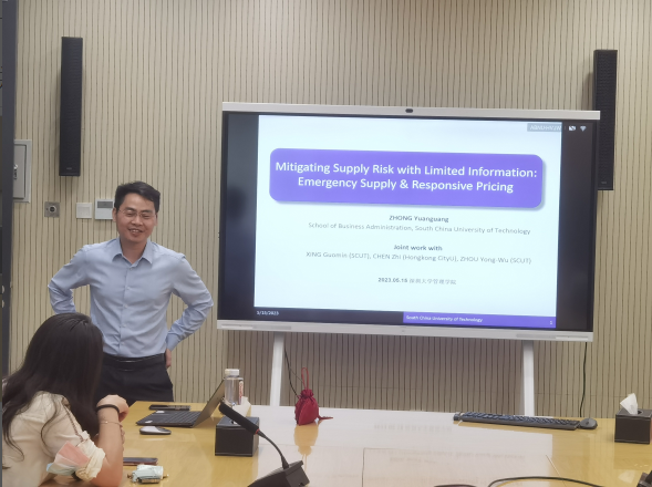 2023年5月15日下午,深圳大学40周年校庆800场学术活动(第762场)暨管理学院管理科学前沿论坛(第125期)在丽湖校区明理楼A302会议室成功举行。本次讲座特邀华南理工大学工商管理学院钟远光教授作为主讲嘉宾,主讲题目为“Mitigating Supply Risk with Limited Information: Emergency Supply and Responsive Pricing”,吸引了多名师生参加。钟远光教授现任华南理工大学工商管理学院工业工程系系主任,曾分别入选教育部青年知名学者(2021年)、广东省青年珠江学者(2017年)、香江学者(2017年)。长期从事供应链库存优化、库存共享与分配、优化理论方法与应用等领域的研究,代表性论文发表在MS、OR、MSOM、POM、TRB等多个国际顶尖期刊上。曾获教育部高等学校科学研究优秀成果三等奖、广东省哲学社会科学优秀成果奖一等奖(两次)和二等奖,以及安徽省科学技术三等奖等多项荣誉,并主持了多项国家级、省级科研项目。