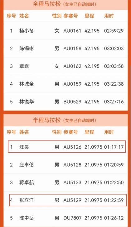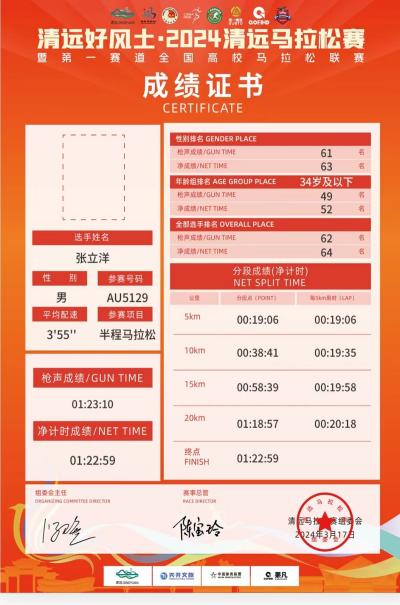 管理学院张立洋净时成绩1小时22分59秒位于深大参赛成员半程马拉松21.095公里组第4名;全国第62名。