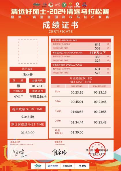 化工学院沈业天同学净时成绩1小时39分位于半程马拉松21.095公里组全国第523名。
