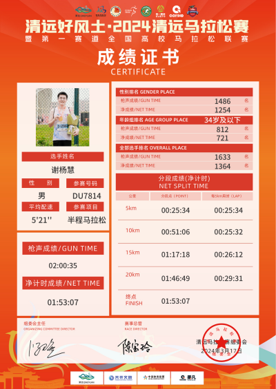 管理学院谢杨慧老师净时成绩1小时53分07秒位于半程马拉松21.095公里组全国第1364名。