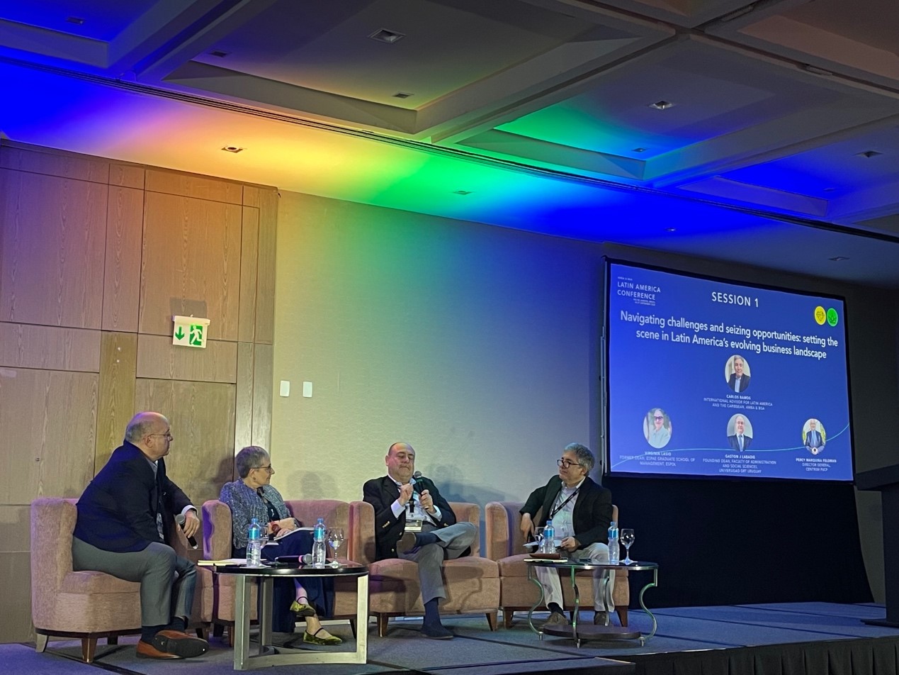 会议涵盖了多个重要议题,涉及商学院的声誉管理、技术与创新、可持续创业、领导力发展、拉美地区商科教育发展等多个方面。会议期间,来自世界各地的专家学者通过主旨演讲、分组讨论等形式,分享了各自领域的最新研究成果和实践经验。9月26日下午,我校商学院院长张卫国教授作为嘉宾分享深圳大学商科教育发展现状、MBA项目特色、学院产学研合作和产教融合等内容。蒋建武教授分享了我院国际化相关事宜,与会嘉宾亲切交谈商学院国际认证和EDP等项目建设相关经验。