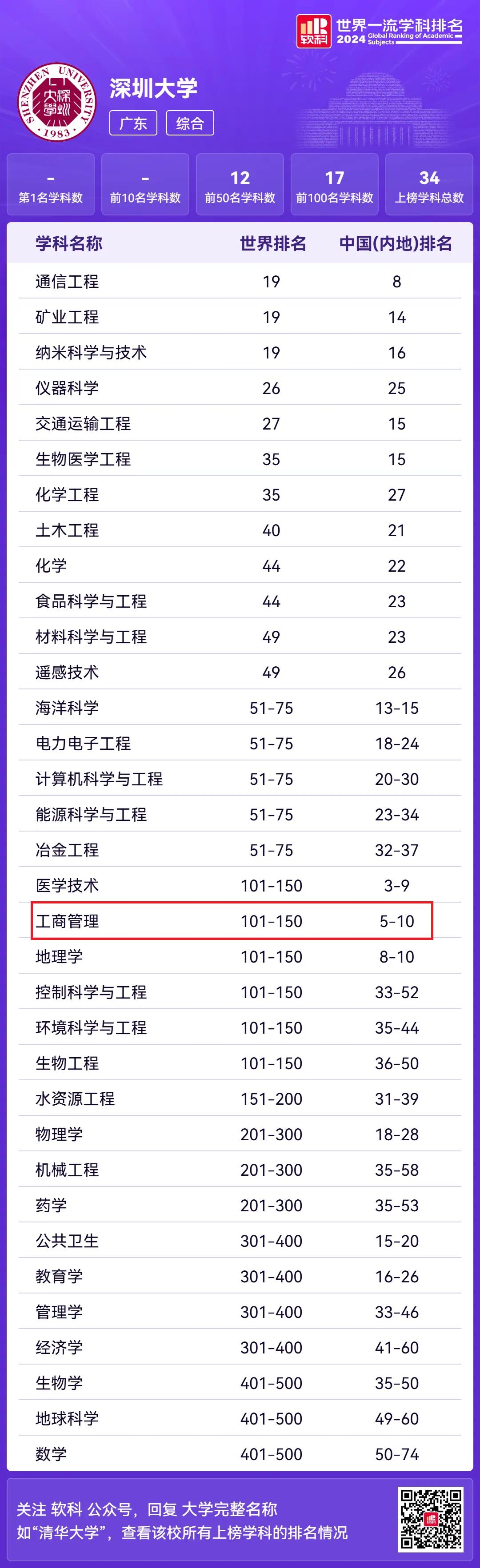 深圳大学工商管理学科“软科世界一流学科排名”位列前茅