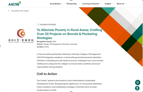 美国佛罗里达州坦帕市当地时间 2025 年 4 月 6 日,全球最大商科教育联盟 AACSB (国际精英商学院协会)宣布,深圳大学管理学院 “助力农村纾困的品牌和营销战略” 项目荣获 2025 年度 AACSB“最具启迪创新奖”(Innovations That Inspire)。这是国内第5所获此殊荣的商学院,标志着中国高校在将商科教育深度融入乡村振兴战略、推动社会价值创造领域的探索再获国际认可。该奖项2025年度全球仅 26 个项目入选,深圳大学与北京交通大学经济与管理学院成为本年度中国仅有的两所获奖院校。AACSB 评审委员会高度评价该项目 “通过系统性的品牌建设与创新营销,为农村经济注入可持续发展动能,展现了商科教育对社会问题的深刻洞察与解决方案的全球示范意义”。