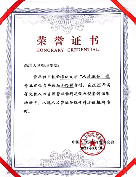 此次获奖标志着深圳大学人力资源管理系在微专业建设领域的创新实践获得了学界和业界的广泛认可。未来,人力资源管理系将继续发挥学科优势,进一步深化校企合作,优化人才培养模式,为服务国家人才强国战略贡献更多智慧与力量。