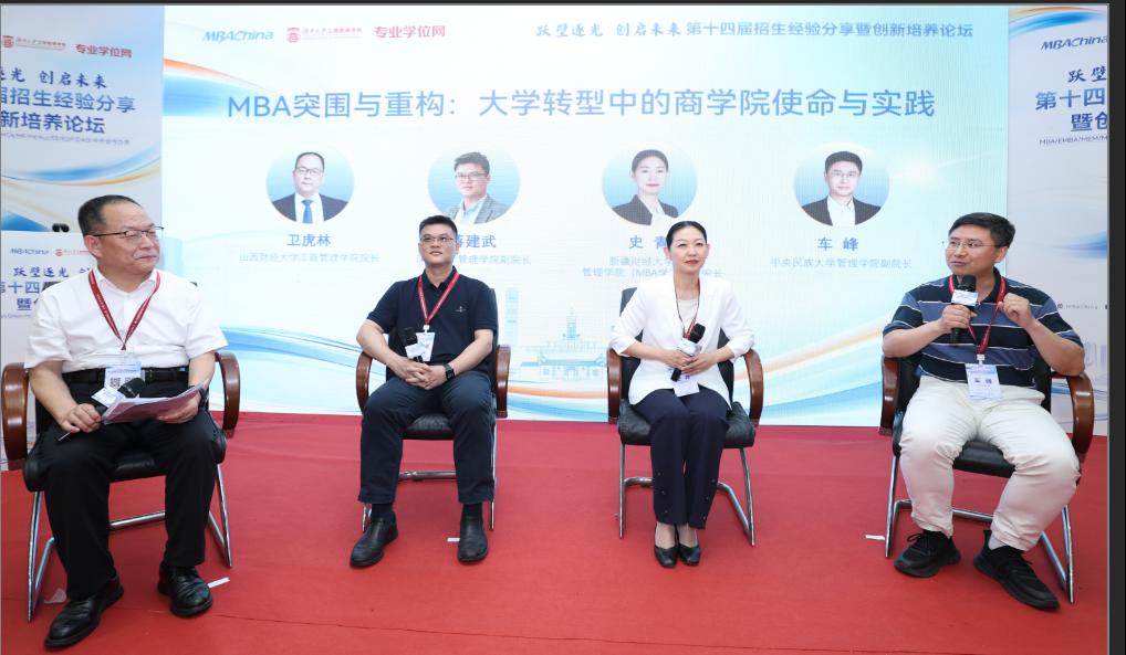 山西财经大学工商管理学院院长卫虎林、新疆财经大学工商管理学院(MBA学院)副院长史青、中央民族大学管理学院副院长车峰、北京航空航天大学MEM中心主任闪四清、西北工业大学MEM中心主任杨宏玲、江南大学商学院MBA/MEM教育中心招办主任孙君敏、华中科技大学管理学院MBA教育中心主任罗光、北京物资学院MBA教育中心主任张喜才、香港中文大学工商管理硕士(MBA)课程市场推广及招生区域负责人郭越、中国政法大学MBA教育中心副主任兼办公室主任布仁巴图、电子科技大学终身学习中心主任陈德富、香港中文大学MBA项目助理行政主任罗若曦、西交利物浦大学西浦国际商学院招生主任(非全日制)邹瑶、澳门旅游大学创意旅游与智慧科技学院院长赵伟兵、同济大学经济与管理学院高管教育EE中心副主任胡玉清出席会议并做主题分享。与会代表们直面市场环境变化、考生需求迭代与技术革命冲击等挑战,共同探索招生培养的新理念、新模式与新生态。