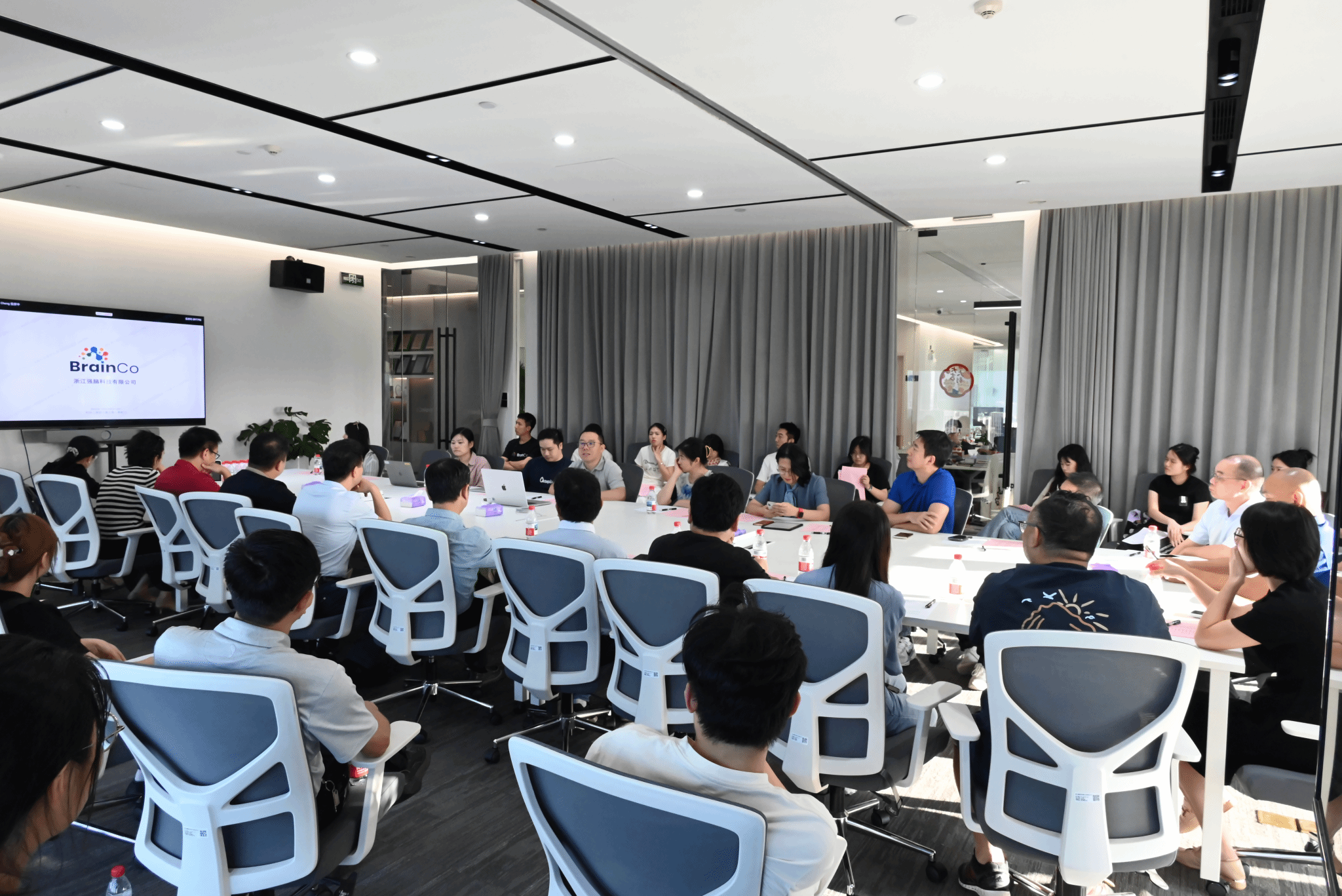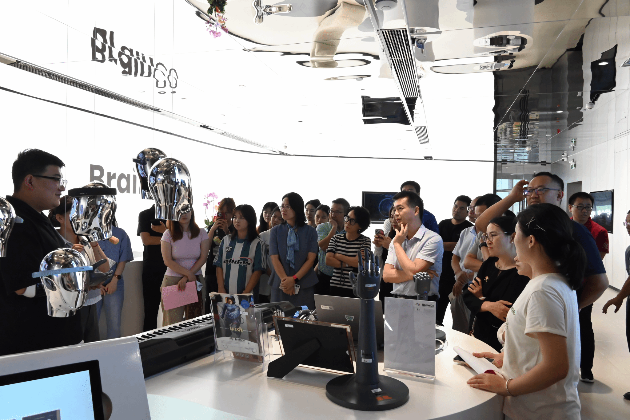 在参访过程中,强脑科技公司副总裁程交先生对大家的到访致以热烈的欢迎,邀请参会人员前往企业展厅身临其境地体验强脑科技公司的全线脑机产品。首先,强脑科技公司的成员以非常特别的方式向参访团队展示智能仿生领域的脑机产品,由受益于公司仿生产品的残疾人员工穿戴智能仿生手来向大家展示产品的独特之处。大家尝试与穿戴仿生手的员工进行“握手”互动,在现场欣赏了残疾人士借助仿生手的帮助成功弹奏了钢琴曲,深刻感受到脑机接口技术正在从科幻走向现实。其次,参访团队了解了公司在智能康复领域的脑机产品。开心果脑机接口社交沟通训练系统基于社交脑网络算法的理论支持,帮助孤独症谱系儿童通过社交脑网络神经反馈训练提升社交、语言和思维能力。而专注欣产品主要侧重儿童脑机接口注意力训练,主要的核心优势包括:个性化训练、多维有趣、适当激励、效果可追踪。最后,参访团队成员体验试戴了FocusZen正念舒压智能脑环,详细了解其在电子消费品领域的脑机产品,通过实时的动态数据可以具体了解使用者的压力或焦虑情况,同时可以通过配套的冥想课程来舒缓调节。这种“正念+科技”的结合,不仅提升了冥想效率,还能帮助人们逐渐掌握大脑状态的自我调控技巧,真正做到“身心合一,念随心转”。