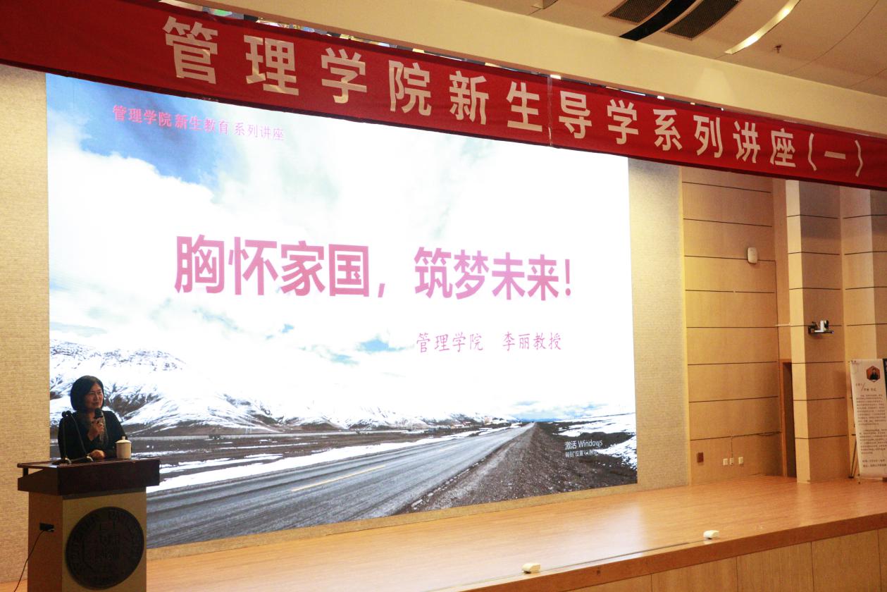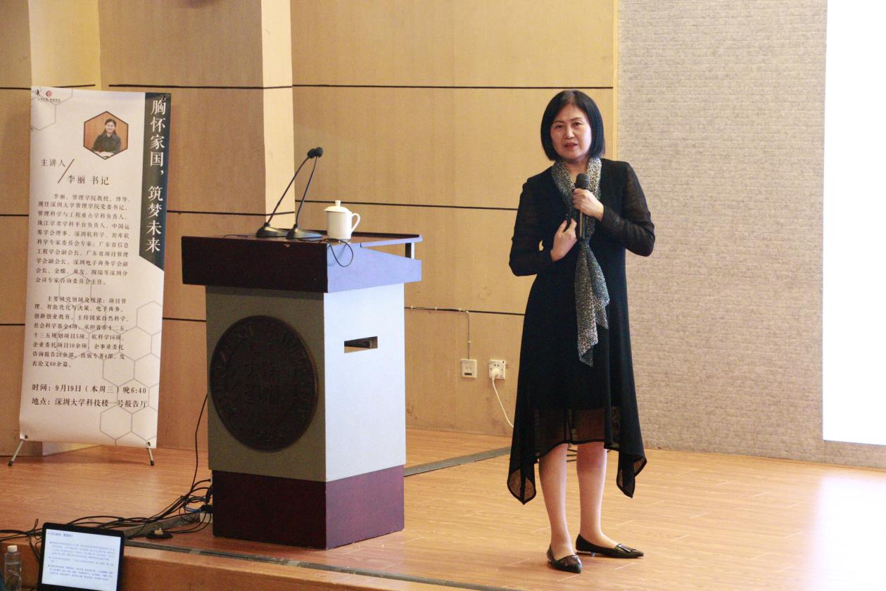 为贯彻落实习近平新时代中国特色社会主义思想、党的十九大精神和新时代全国高等学校本科教育工作会议要求,9月19日晚上7点,管理学院在科技楼一号报告厅举办了新生导学系列讲座第一场,本次讲座的主题为“胸怀家国,筑梦未来”,旨在引导新生们树立正确的人生观、价值观,更加积极健康地投入到学习生活中去。讲座由深圳大学管理学院党委书记李丽教授主讲,学工办辅导员老师和2018级全体新生聆听了讲座。