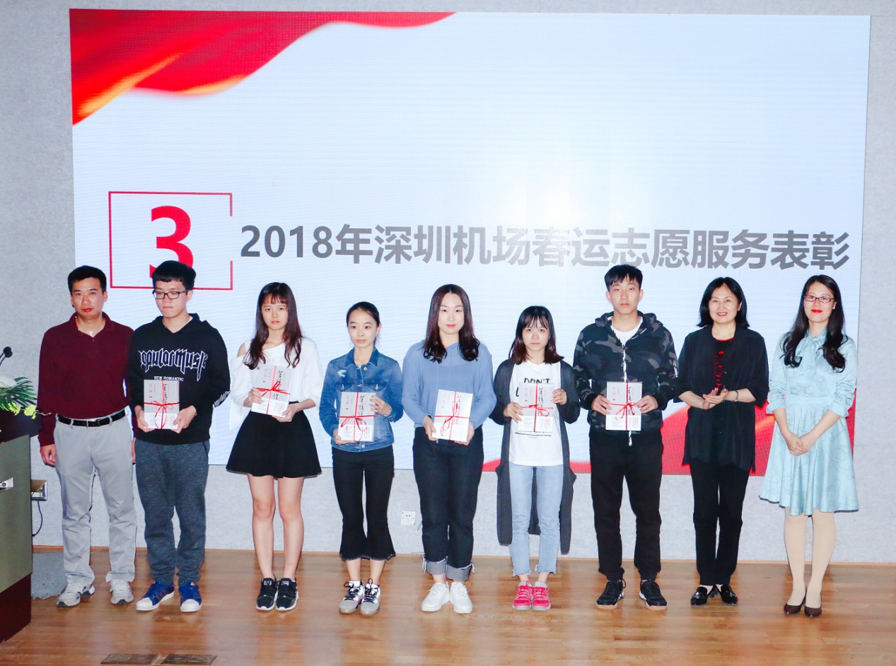 紧接着,会议进行“2018年深圳机场春运志愿服务表彰”议程。在2018年春运期繁忙的机场里,管理学院党委联合深圳机场义工联,组织学院本科生参加了此次义工服务。他们热情的服务为广大旅客出行提供了极大便利,传递了乐于助人的正能量,使累于春运的旅客们感受到了深圳的温度。学院党委书记李丽教授、副书记王嘉蔚老师,以及邀请到的深圳机场团委书记徐丽女士,共同为志愿者代表们颁奖合影。