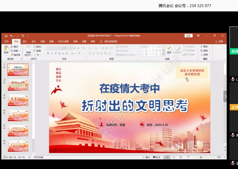 2020年3月20日中午12点30分,管理学院院长李丽教授为全体研究生党员在腾讯会议app线上讲授了题为《在疫情大考中折射出的文明思考》的新学期“思政第一课”,围绕疫情背景讨论当下青年学生应有的觉悟、贡献与担当。