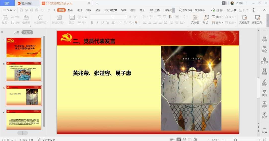 会议一共分为三个环节。第一个环节是观看视频:《央视抗疫系列公益广告:战疫》和《英国留学生辗转回国入境那一刻哭了:身为中国人很骄傲》。第二个环节是党员代表发言,党员代表分别是黄兆荣、张楚容和易子惠。其中,黄兆荣同志为前期“疫情下的管理对策”征文活动的一等奖获得者。