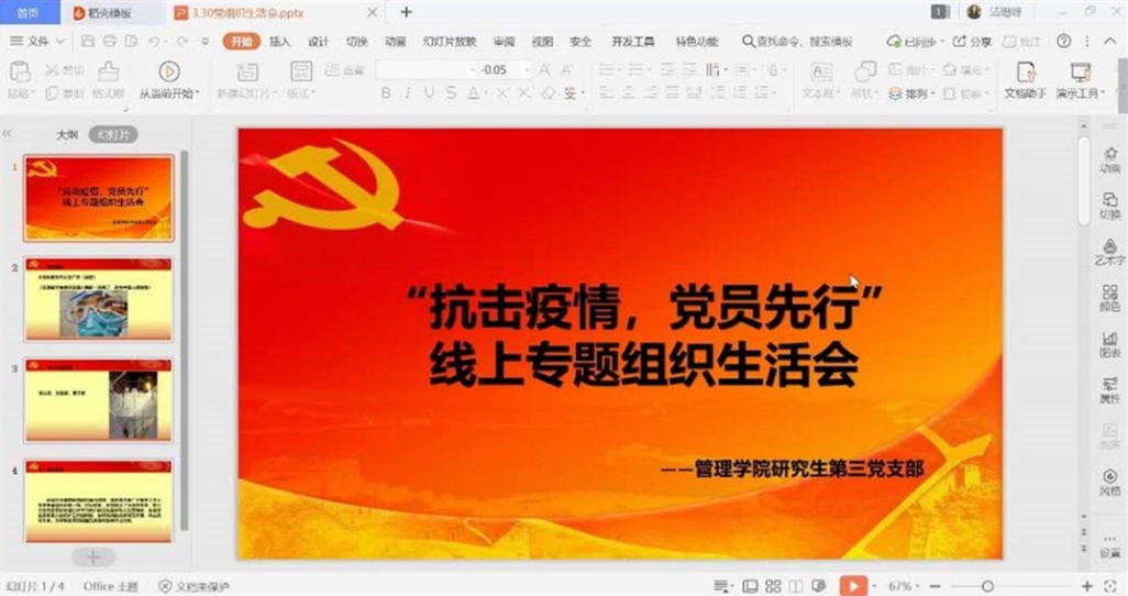 根据深圳大学管理学院党委的统一部署工作要求,研究生第三党支部在腾讯会议上召开“抗击疫情,党员先行”线上组织生活会,旨在交流研究生党员在战疫期间学习、行动、观察、思考的思想感悟,提升团结一心战胜疫情的信念,提升党员的道路自信、制度自信,促进研究生党员在疫情防控和学业发展上发挥带头作用。支部全体党员参加会议,会议由党支部书记麦洁珊同志主持。