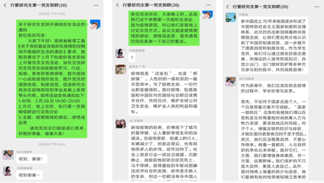 本支部26名党员同志都非常积极踊跃发言,把自己的思考和大家一起分享。植晓铭同志提出,在疫情期间,上至国家,下到个人都做出了很大贡献。习总书记说政府的宗旨就是把人民的生命安全、身体健康放在最高位置上。每天看到白衣天使一批又一批奔赴武汉,一省包一市,还有无数奋战在前线保障基础生活设施的无名英雄们,我深受感动。白墨涵同志提出,作为学生党员,我们可以通过报名防疫志愿者、向身边的人宣传防疫知识、自觉少出门,出门做好防护等多种方式参与到抗疫中,共同战胜疫情!罗诗诗同志认为在此次疫情中,政府和社会在面临危机时,有表现优异的地方,也在一些板块存在不足,综合而言,希望在以下方面改进,增强我国城市的健康与韧性。其一,重申城市发展理念,重视环境与自然保护,加强国民素质教育和环境保护意识。其二,完善国家现代化治理体系和危机应对机制,我国的危机应对体系机制相对而言还有不够完善的地方,需要在疫情中总结不足,及时完善。其三,强化公众危机意识教育。在这次疫情危机中,公众自身是需要反思的,一些人的非理性情绪较大,部分人群缺乏面对危机的正确心态,危机意识不当,极个别人在某些层面自利心理过重,将个人利益至于国家利益之上。其四,重视舆论影响,对一些不良媒体现象进行处理,官媒要及时辟谣,发布正确报道。大众传媒作用的发挥,还需要政府和社会共同强化。王宝琳同志通过向武汉亲属了解,指出了很多疫情防控问题,对于失误、漏洞和空白,应该采取什么态度?是愧疚反思,尽快纠正弥补,还是颟顸无知,甚至推诿甩锅——我相信这是众目睽睽之下衡量称职与否的一杆秤。群众不能接受文过饰非,不能接受揽功诿过,特别是在这样人命关天的事情面前。作为公共管理专业的我们,或许可以从这次疫情学到更多,在未来的工作岗位遇到类似事情时,我们应是怎样的态度。每位党员同志的发言都非常精彩,大家从交流中收益颇丰。
