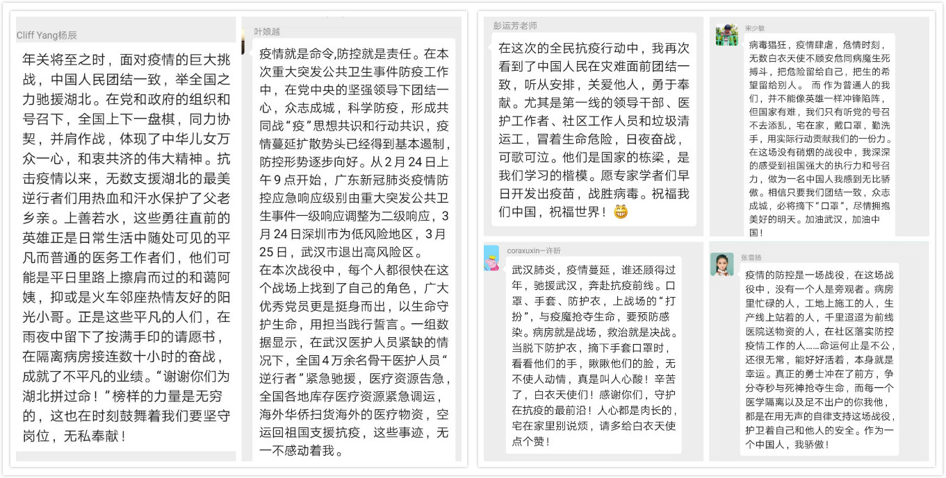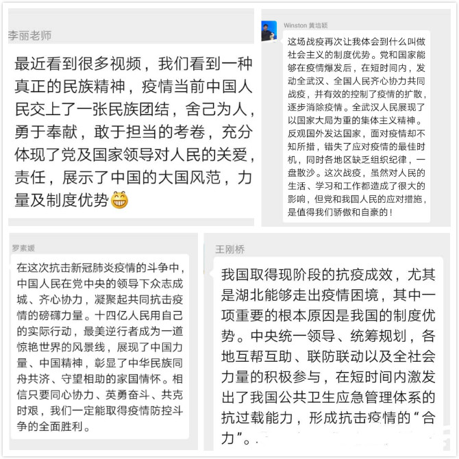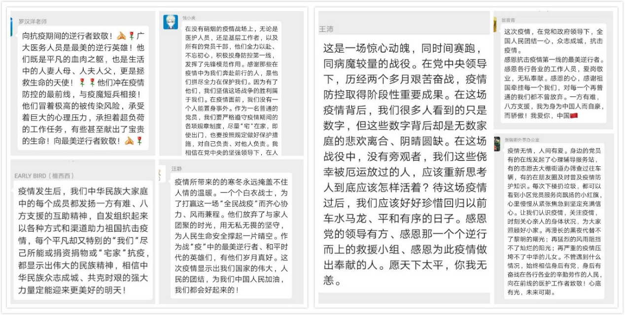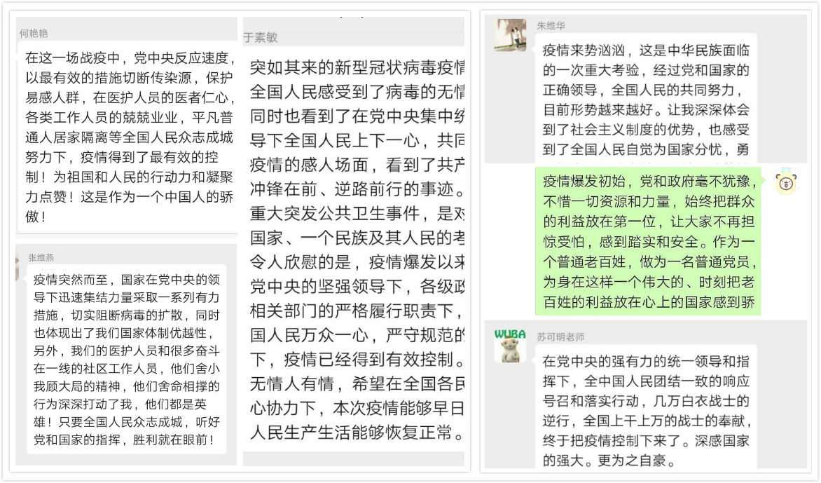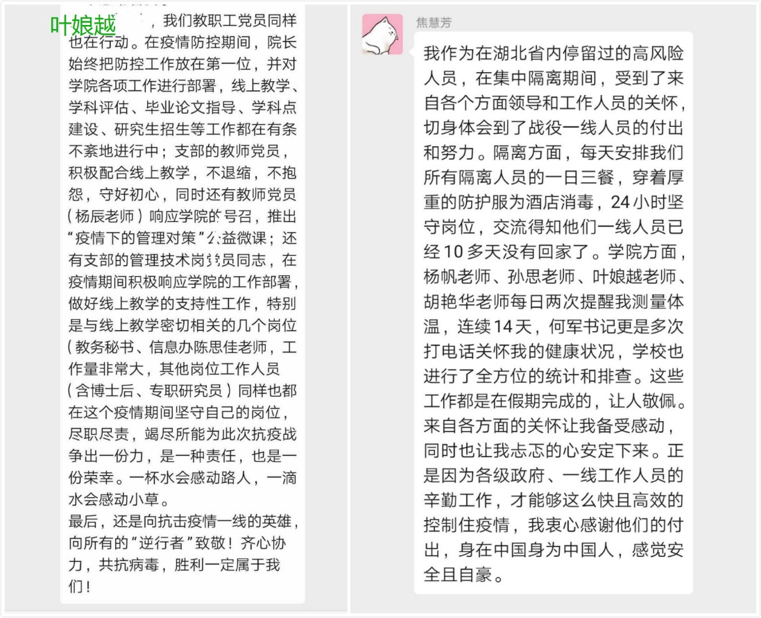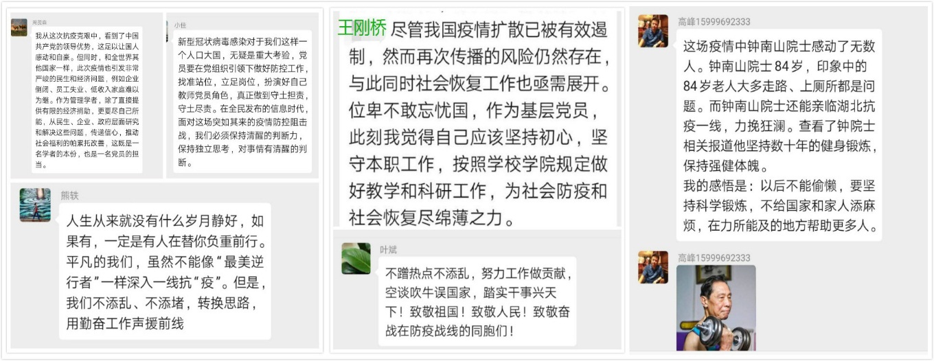 管理学院教工第三党支部支委在3月16日上午收到学院党委工作布置后,迅速召开了线上会议,讨论本次组织生活如何开展,并最终确定于27日以党员同志播阅支部群分享的微视频、短文的线上(微信群讨论)方式进行交流分享。确定会议方式后,支委搜集各式素材于21日在微信群进行分享,给支部党员充足的时间进行学习感悟。