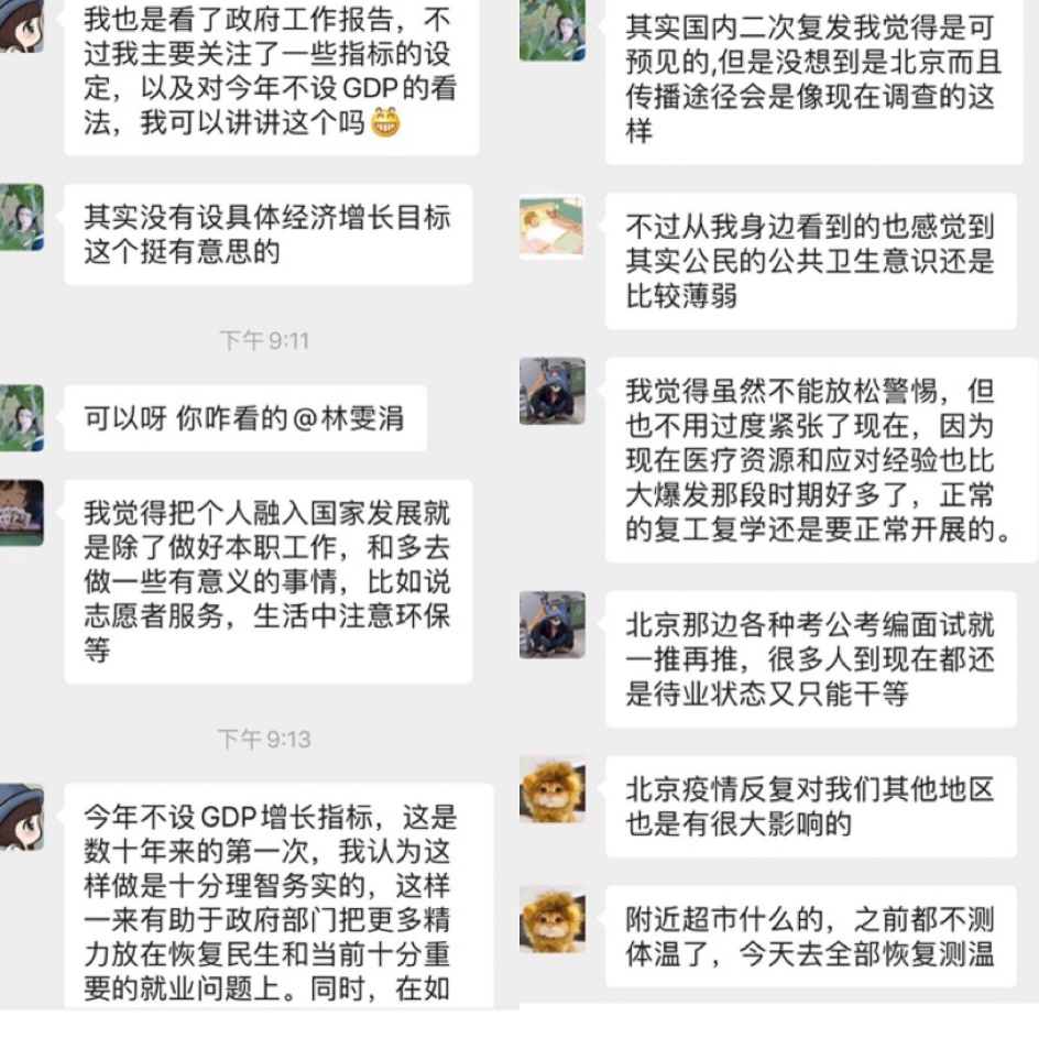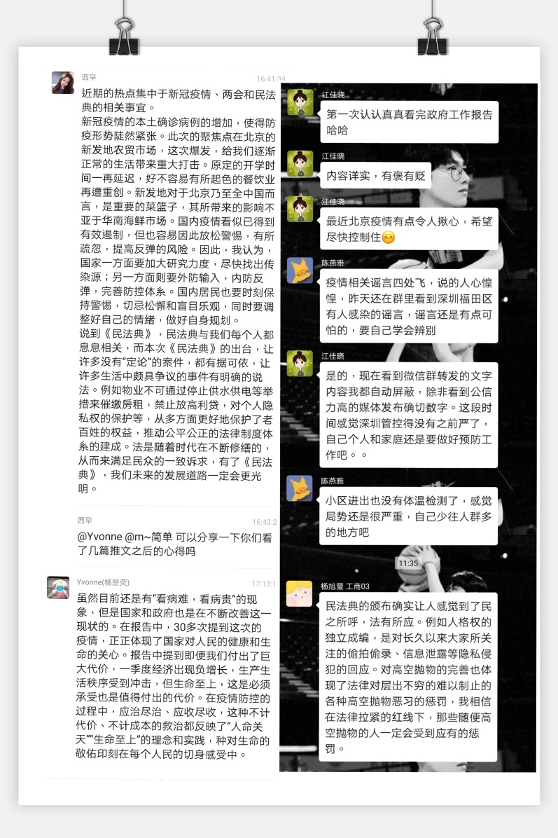 为贯彻落实校党委开展学习两会精神相关要求,深圳大学管理学院2016级本科党支部在6月份开展的“主题党日”活动中,采取小组微信群交流形式,通过学习2020年政府工作报告、《民法典》等一系列内容,各位党员从多方面、多角度较深入地交流学习感悟,各抒己见,讨论颇为热烈。
