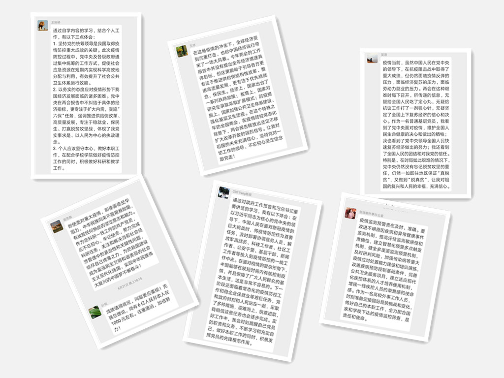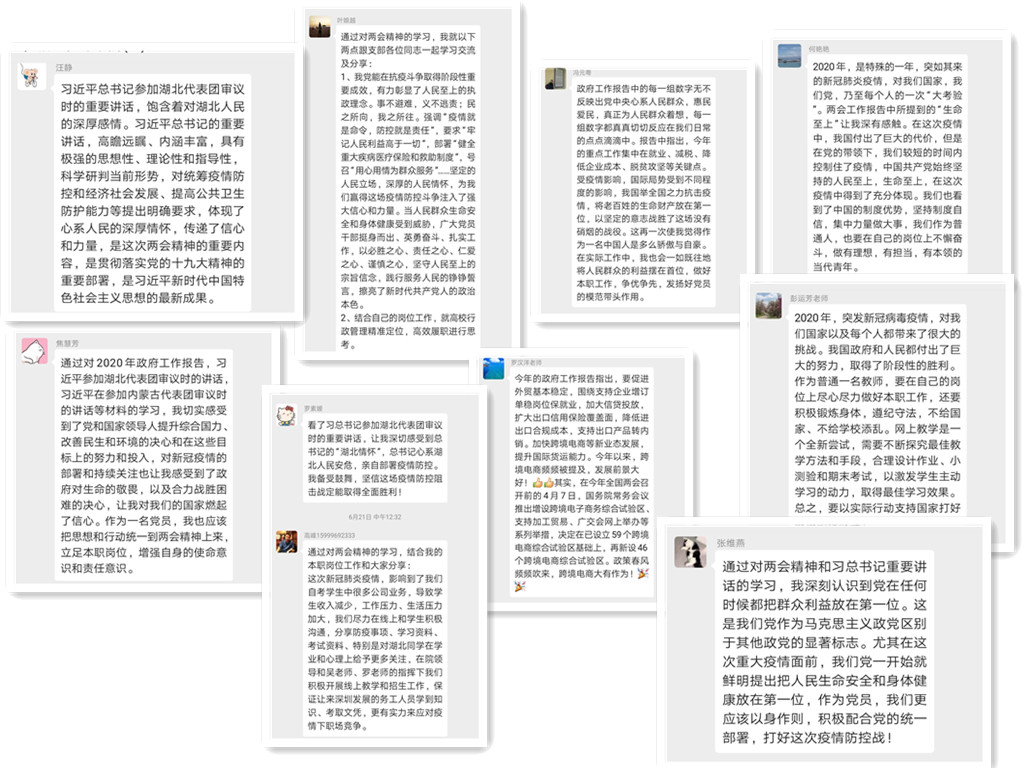 第三支部支委在6月17日下午收到学院党委工作布置后,迅速召开了线上会议,讨论本次组织生活如何开展,并最终确定于21日、以党员同志播阅支部群分享的2020年政府工作报告、习近平参加湖北代表团审议时的讲话、习近平在参加内蒙古代表团审议时的讲话、解读政府工作报告 i思机器人帮你划重点、李清泉校长“思政第一课”学习2020年全国两会精神等短文和视频以线上(微信群讨论)方式进行交流分享。