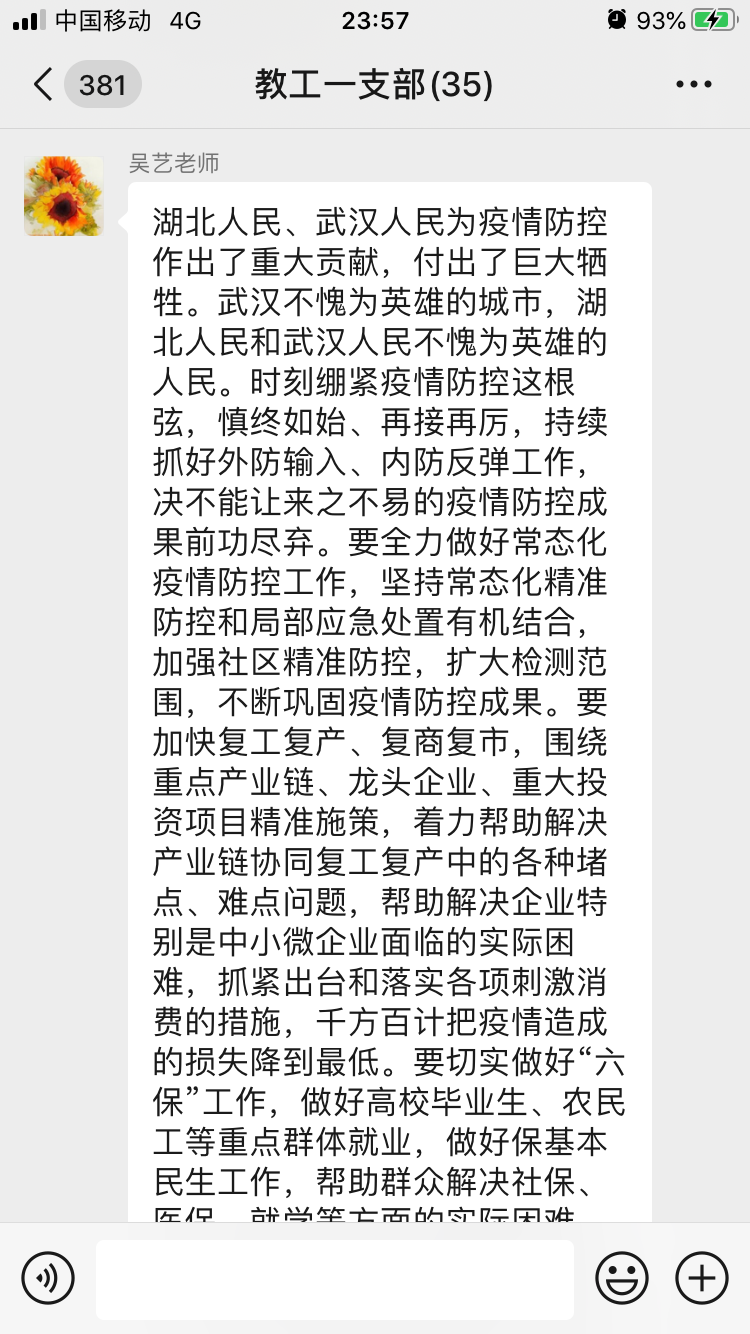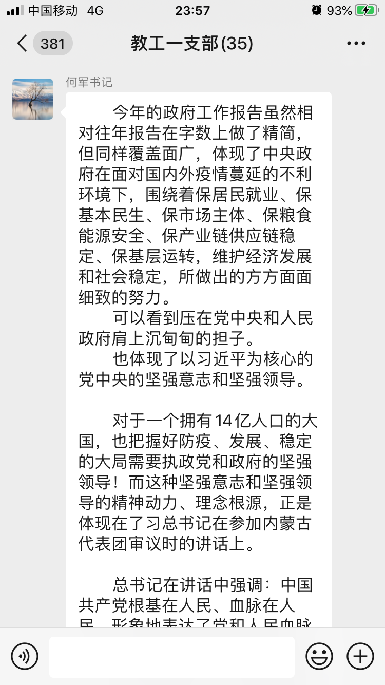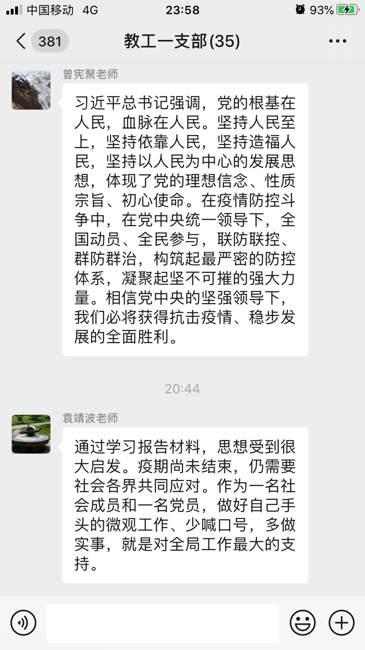 在当前疫情防控阶段,主题党日活动依然采用“线上形式”组织,党员教师可自由选择学习内容,自学后在支部微信群分享个人感悟及心得体会。学习材料内容丰富,包括2020年政府工作报告、习近平参加湖北和内蒙古代表团讲话,以及李清泉校长“思政第一课”。支部微信群非常活跃,先后有30名党员老师在微信群中分享个人的学习心得,活动参与人数占比接近90%。学习体会细致入微,既有对疫情防控的理性思考,又有对复工复产的合理建议;既有忧国忧民的家国情怀,又有坚守本职的自觉意识。