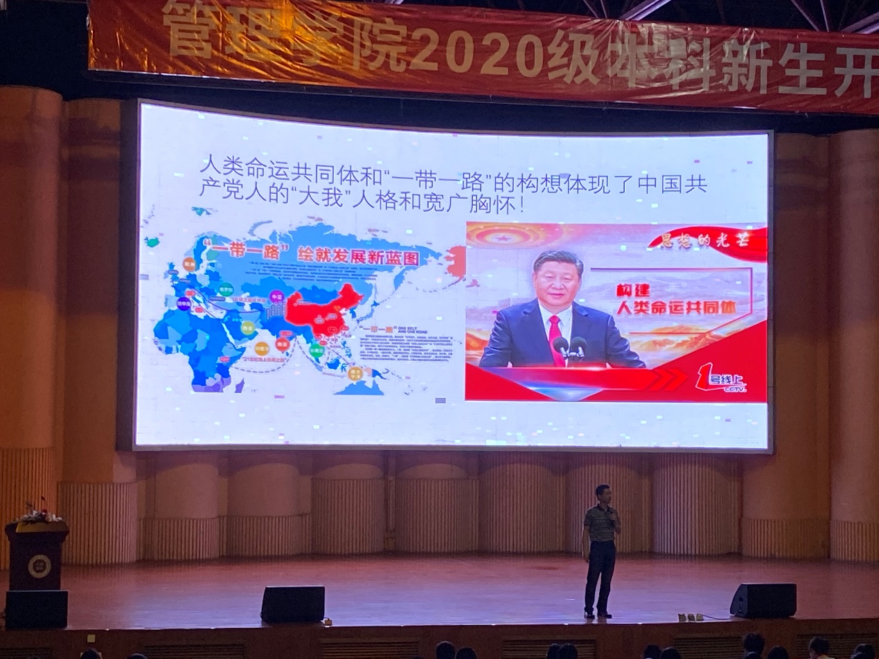 为贯彻坚持用习近平新时代中国特色社会主义思想铸魂育人,加强学生形势与政策教育,引导学生准确理解党的路线、方针、政策,正确了解国情、党情、社情、民情的要求,管理学院于2020年9月19日在演会中心举办了主题为“筑梦·逐梦——担当责任,追求成长,推动改变”的思政第一课。讲座由学院党委书记何军老师主讲,全体2020级本科新生参加了此次讲座。
