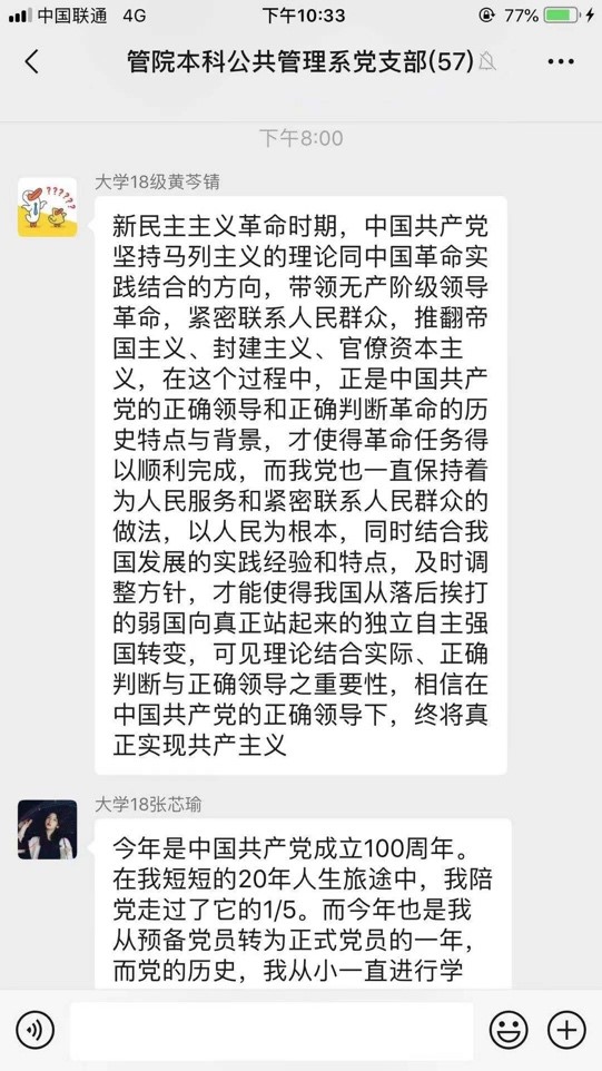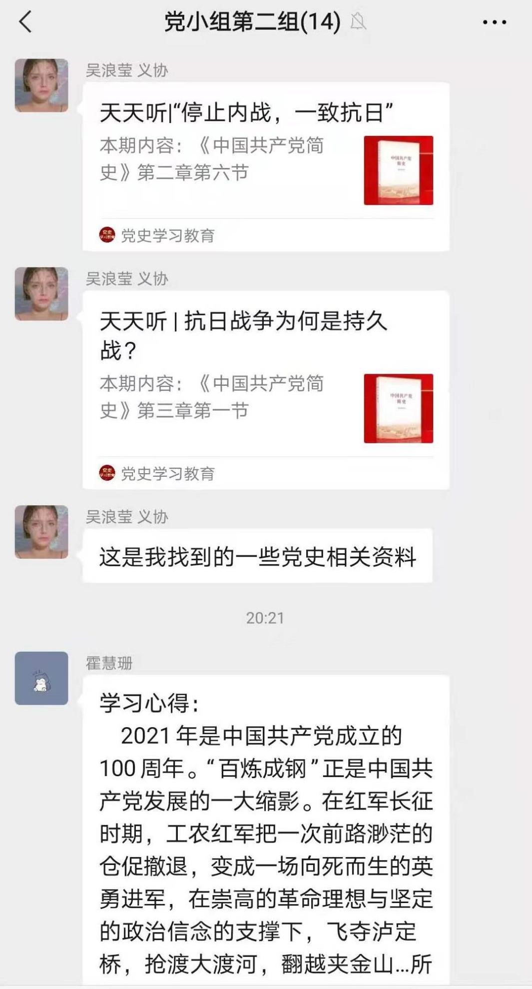 4月19至25日,各本科生党支部开展了集中学习与交流研讨。此次学习通过线上方式进行,各支部提前将党史学习资料发布在微信群中供党员自学,之后集中组织线上的交流与研讨,增强了学习的灵活性,同时极大发挥党员的主观能动性。