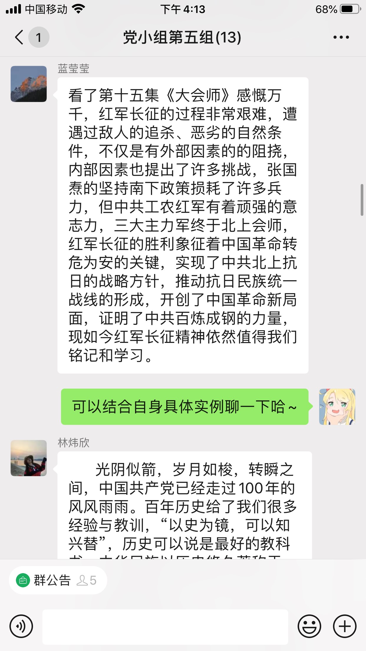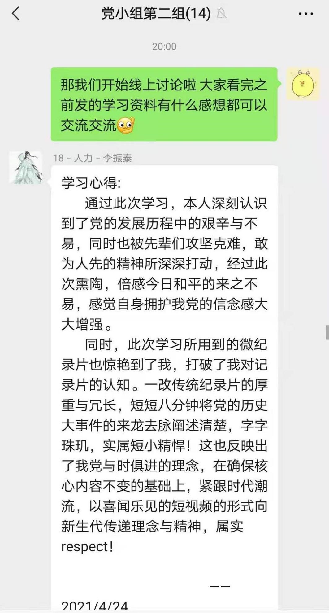 各位党员以长征精神、井冈山精神等革命精神以及遵义会议等一些革命事迹为切入点,发表了自己对党史学习的感悟与心得。一些党员在交流中表示,新民主主义革命时期历史是中国共产党一步步由小到大、由弱到强、不断从胜利走向更大胜利的创业史、奋进史,是我们党带领中国人民推翻“三座大山”、实现民族独立和人民解放的斗争史。通过党史学习,自己深刻认识到了红色政权来之不易、新中国来之不易、我们现在的美好生活来之不易。同时也意识到每一代人都有自己的历史使命,新的长征永远在路上。要继承和发扬长征精神,沿着英烈的足迹,怀着对英烈们的庄严承诺,从生活和实践中承担使命,为国家的发展与前进而蹈厉奋发。在日常学习中,也要努力把学习成果转化为只争朝夕、真抓实干的实际行动。