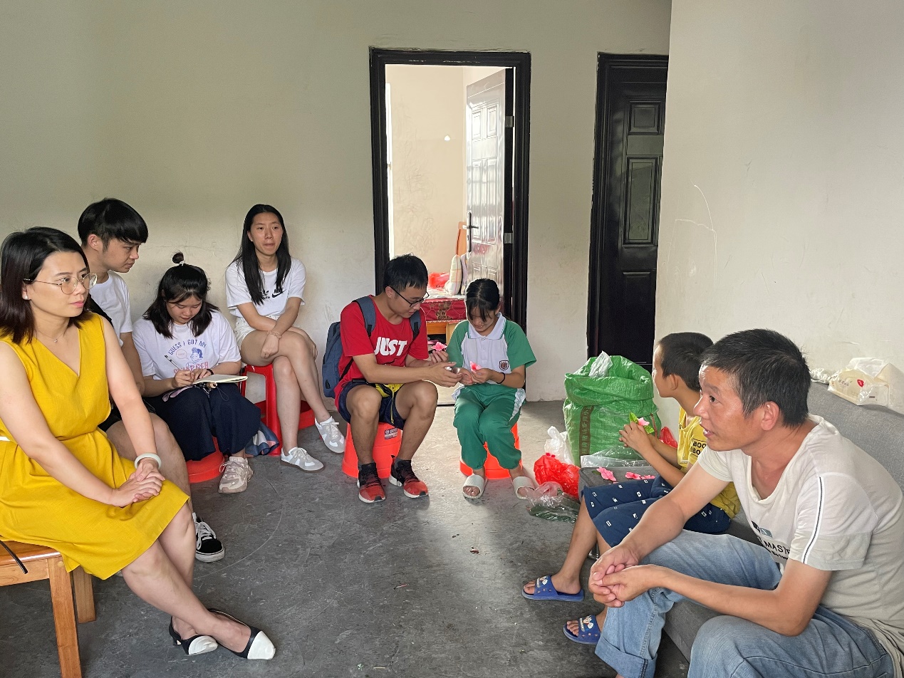 之后,志愿者们在罗艳校长的带领下走访了住在德福社区的四所学生家庭。在走访过程中了解到,这里的搬迁户基本上是非常贫困的山区人民,受教育程度低,宗族意识强,在原先的地方就有农田和庄稼,所以在搬迁之初就面临很大困难,甚至有些家庭不愿意搬。而搬迁后,家庭主要劳动力需要外出务工,只留下孩子和单亲以及年迈的老人,有的甚至是单独和哥哥姐姐住在一起。外出务工的父母给孩子留下一部手机,很多孩子因为年纪太小还没有办法自己买菜做饭,而南山小学在政府的支持下给学生们提供免费的营养午餐。因此,南山小学的老师们除了教学,还要到山里劝家长们易地搬迁,为孩子入学排忧解难,甚至充当父母的角色,时刻关心学生们的生活。走访结束后,志愿者们为学生们送上精美的书包,其中有一位学生,与志愿者们有说有笑做着手工,在临别时送给所有老师们每人一朵手工做的花。