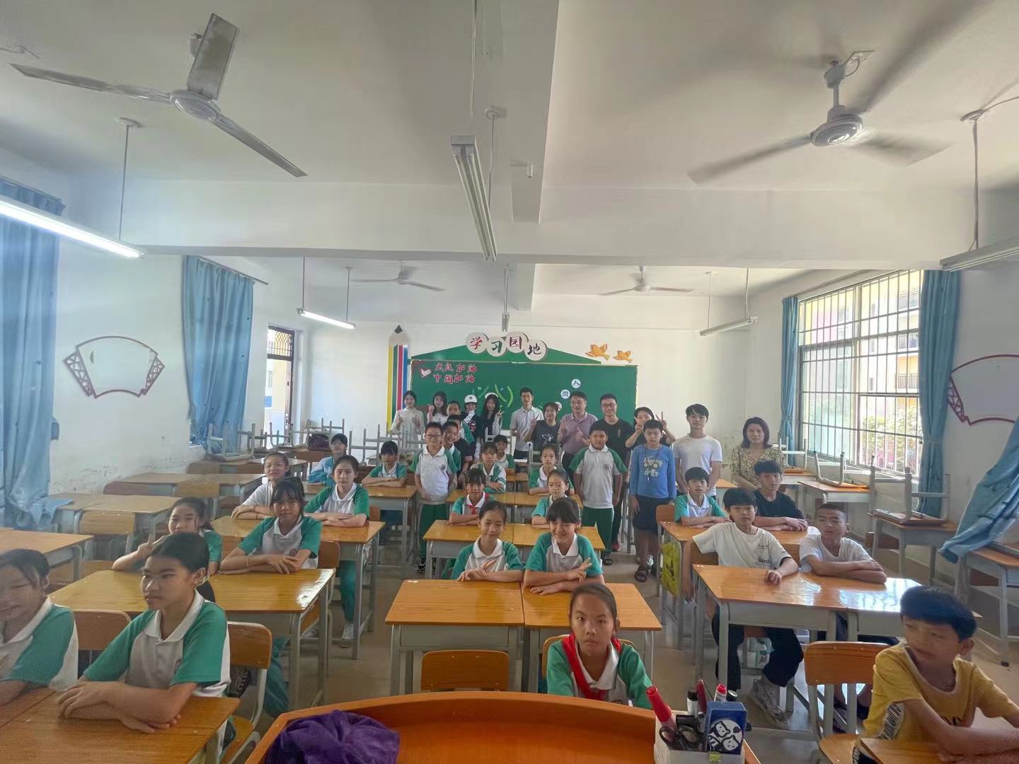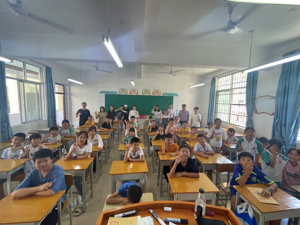 经历了八个小时的车程,“桂梦之队”顺利抵达广西百色市德保县。这次支教的地点在德保县城关镇南山小学。南山小学是一所由深圳市南山区在2018年援建的移民安置小区配套小学,五月建校,九月招生,堪称“深圳速度”。南山小学的生源主要为移民安置小区贫困户子女和周边村屯及部分外来务工人员子女。7月12日早上八点,在经罗艳校长召开老师介绍会和学生动员大会后,志愿者们带领同学们来到各自的教室展开了第一天的教学活动。这次支教授课对象为四、五年级的学生,分为A、B和C三个班,每个班共有35人,志愿者们根据同学们感兴趣的内容和欠缺的知识,事先安排了舞蹈、素质拓展、自然科普、历史人物、书法、演讲与辩论、地理人文、生理知识、音乐和国际人文等十门丰富多彩的课程。课堂上,他们用有趣的例子引起同学们的兴趣,课堂氛围活跃,同学们上课认真听讲,积极回答问题,收获颇多。