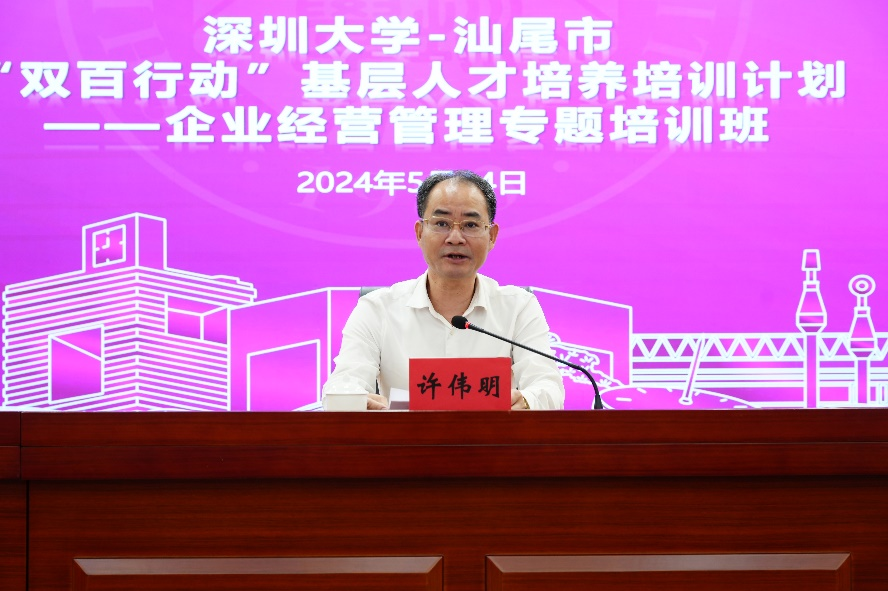 为响应广东省委“百县千镇万村高质量发展工程”,5月14日,深圳大学管理学院党委与汕尾市委组织部“双百专班”携手,开展深圳大学-汕尾市“双百行动“基层人才培养培训计划——企业经营管理专题培训班。培训对象包括200多名汕尾市农村职业经理人、村支部书记、重点村“两委”干部,以及乡村特色产业人才和农村电商从业者。培训班由汕尾市教育局副局长张逸琴主持。