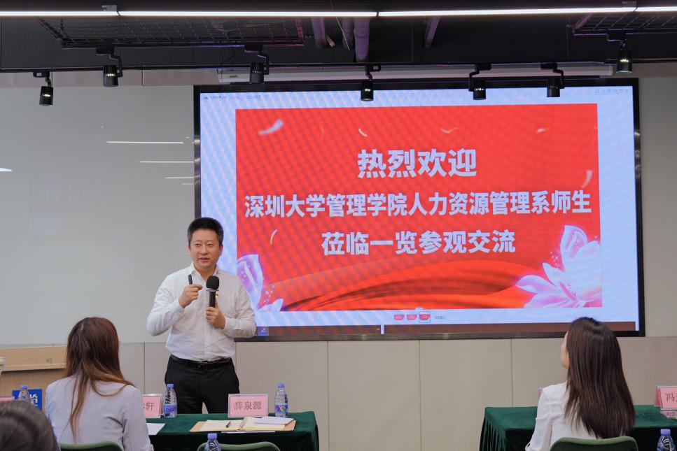 随后,管理学院人力资源管理系教师党支部书记丁婉玲同志向深圳市一览网络股份有限公司介绍了深圳大学管理学院的基本概况以及发展成果,并介绍了在学校党委和学院党委的带领下,管理学院人力资源管理系教师党支部的建设情况。冯元粤老师和蔡林轩老师与与会代表就如何进一步深化产教学研融合、加强校企合作、促进人才培养和科研成果转化等议题进行了深入的讨论和交流,期待双方通过资源共享和优势互补,实现双方在人才培养、科研创新和社会服务等方面的共赢发展。
