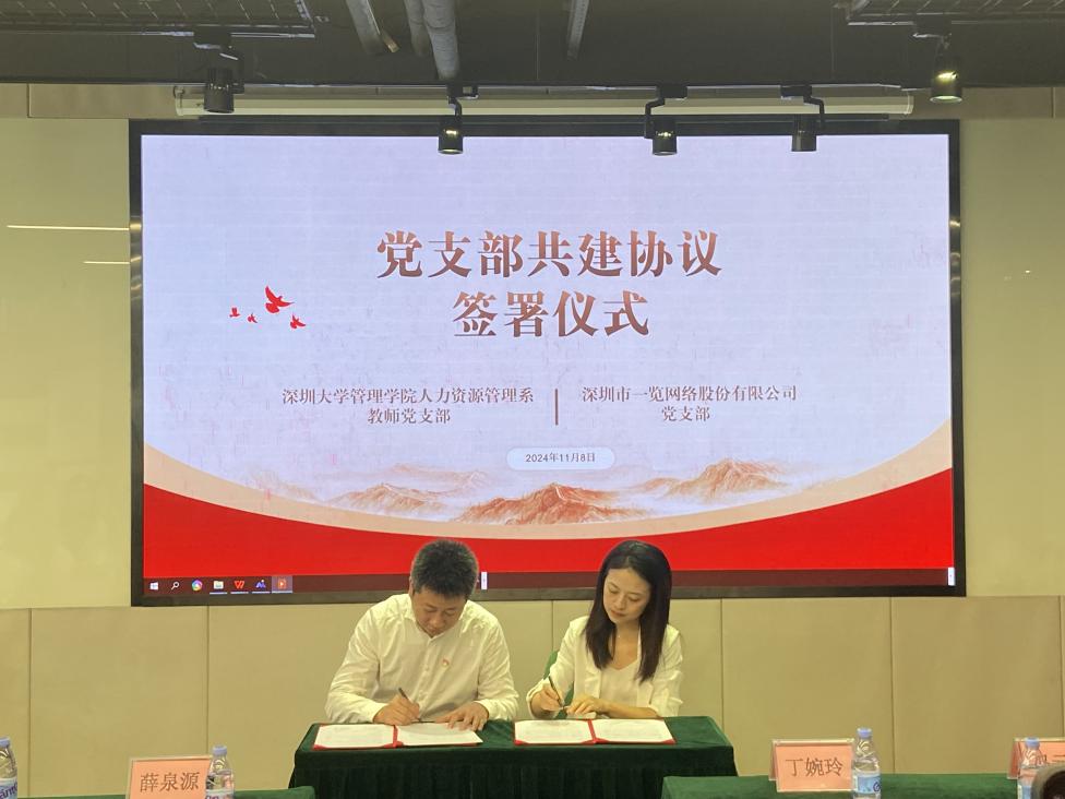 最后,大家就党建工作如何做实并不断创新进行了深入交流,人力资源管理系党支部与深圳市一览网络股份有限公司党支部签订了共建协议。双方党支部将以“资源共享、优势互补、携手共建、先锋同行”为原则,充分发挥各自在党建、教育、科研和企业实践等领域的优势,共同努力实现“创先争优齐努力,结对共建同提高”的工作目标。